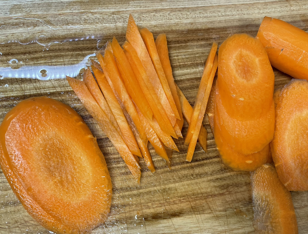 3. 당근은 3/5 정도 길이를 어슷 썰어 채쳐준다.