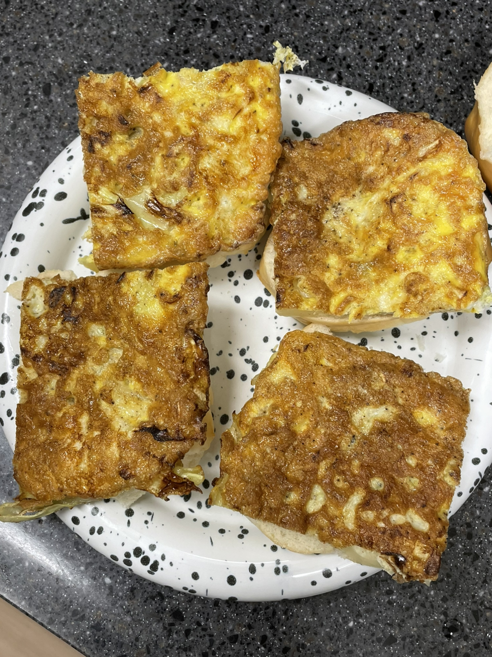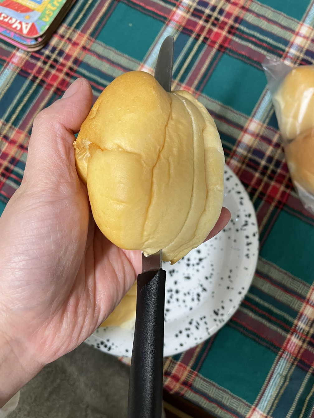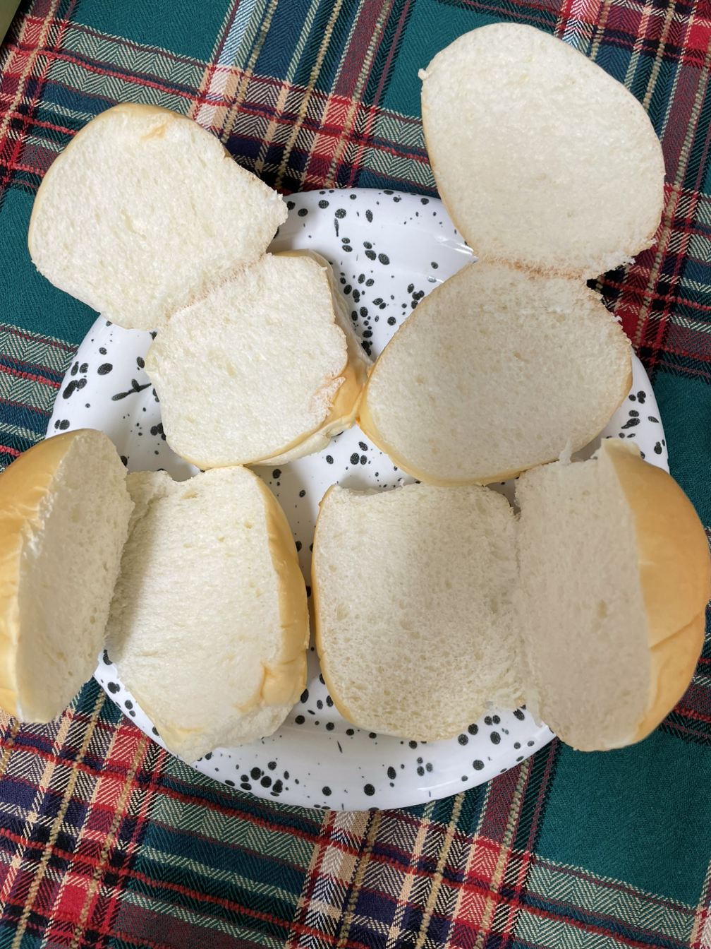 3. 계란이 익을 동안 빵 4개를 꺼내 반으로 갈라 준비해둔다. 우린 짝꿍이랑 나랑 2인이 먹을 양. 사실 하나만 먹어도 배가 든든하다.