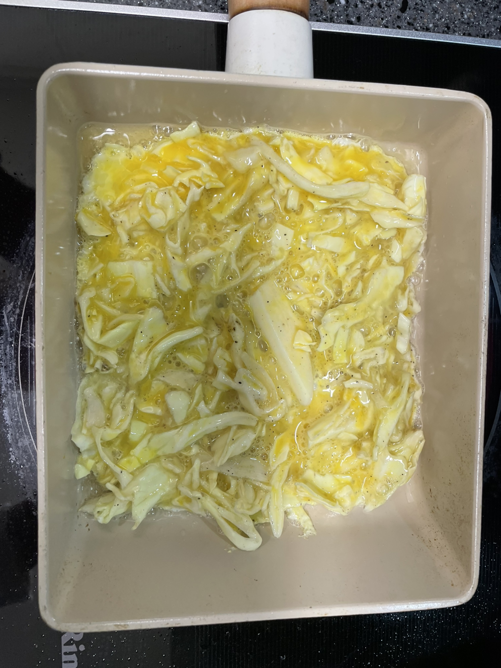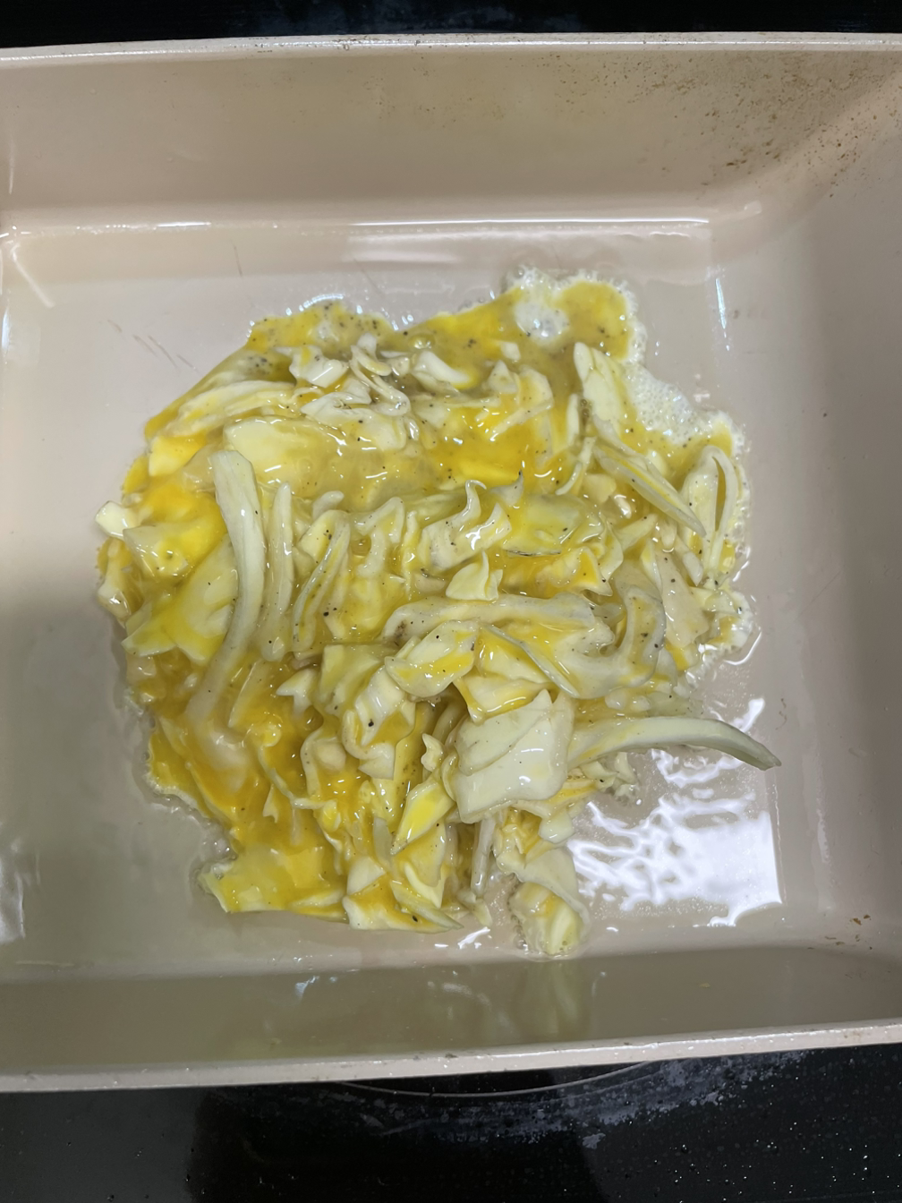 1. 집에 남은 양배추를 종종 썰어 계란 2개와 함께 푼다. 후추와 소금도 톡톡