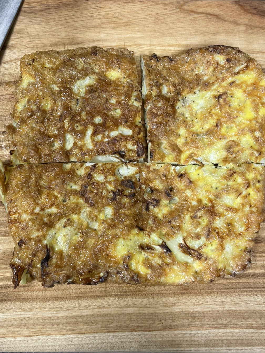 2. 뜨겁게 달군 팬에 사각으로 모양을 잡아 계란 부침을 만든다.