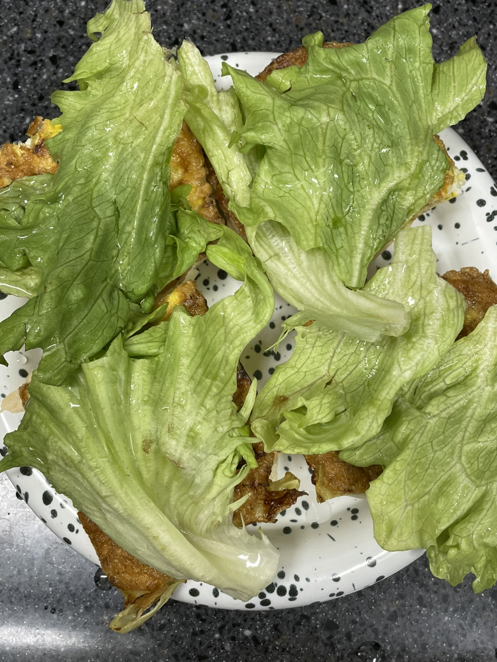 5. 아삭한 식감을 위해 양상추도 올려준다. 집에 샐러드가 있다면 풀떼기를 올려주면 더 풍미가 산다. 사진엔 나오지 않았지만 개인적으로 사과를 슬라이스해서 올려주면 더욱 맛있다.
