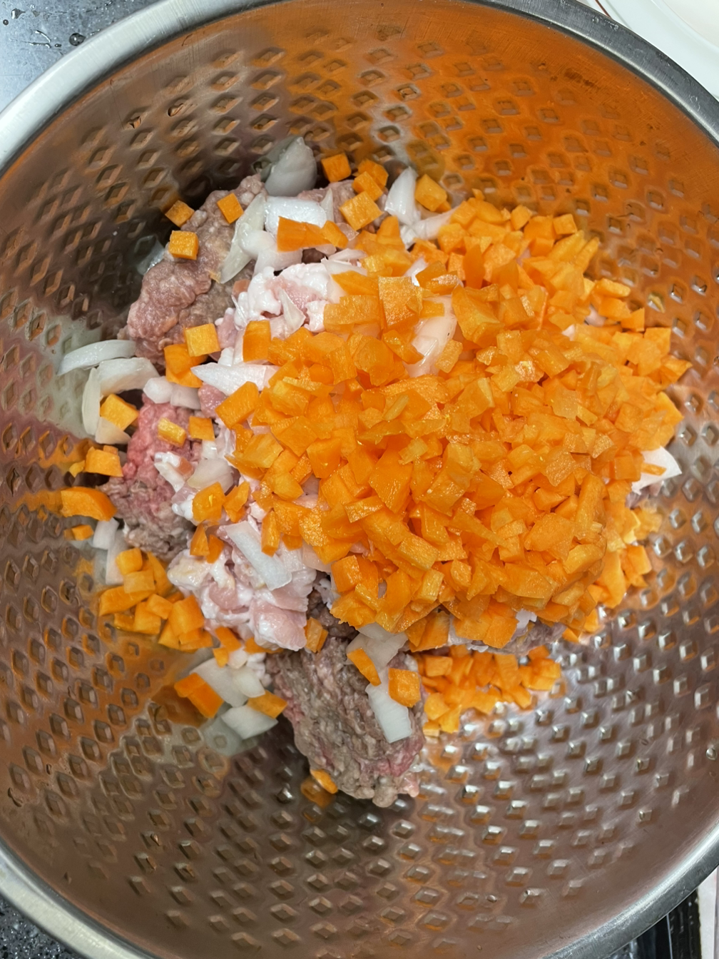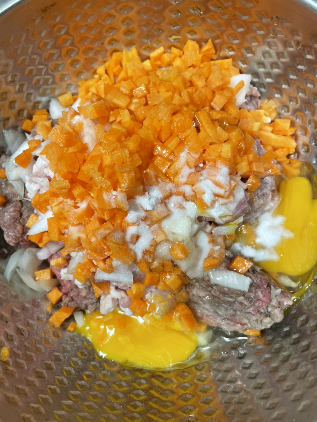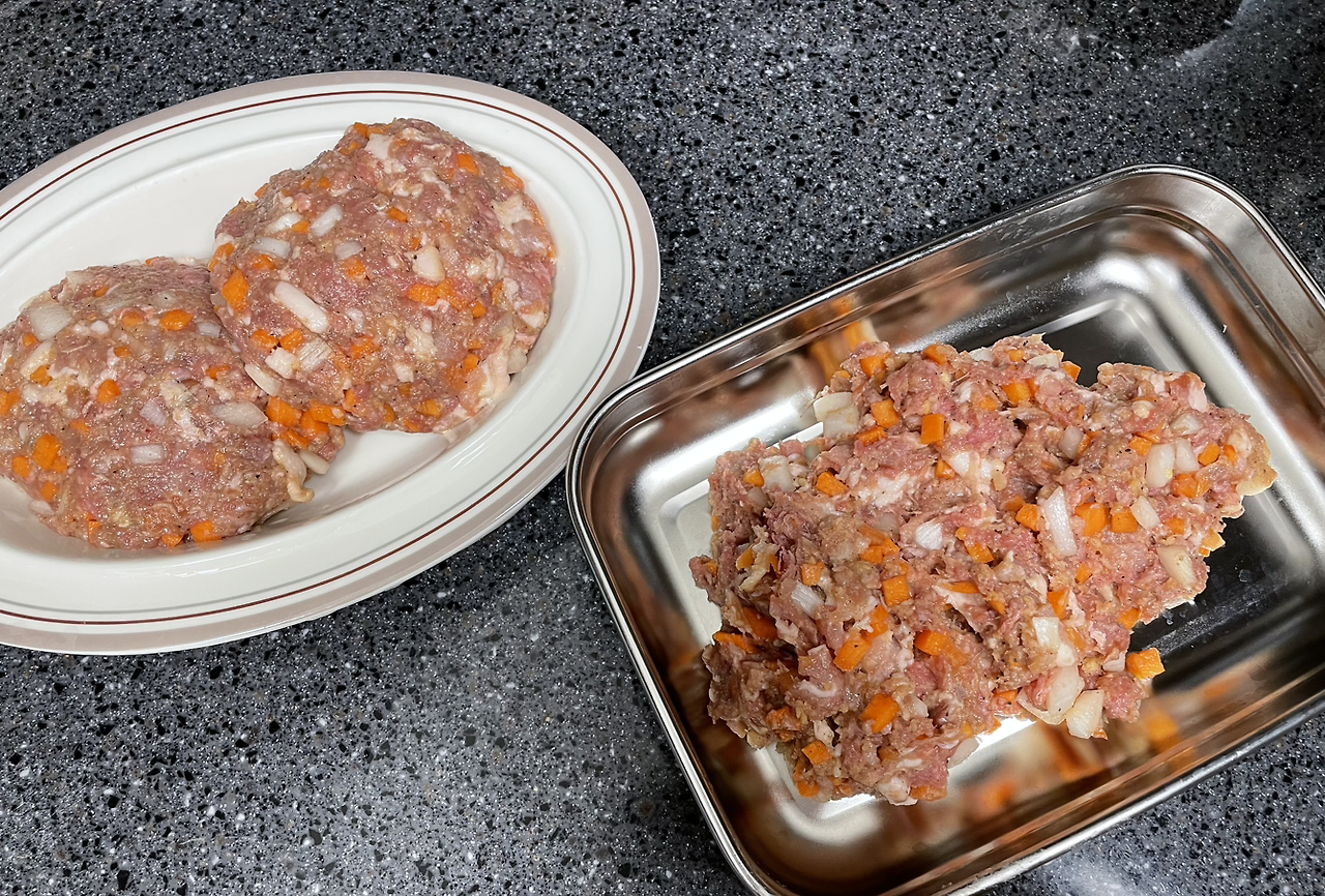 10. 생각보다 양파와 당근이 좀 큰 듯 하지만 내가 먹을거니까 괜찮다 :) 넙적하게 손으로 치대며 둥근 모양으로 모양을 잡아주고 남은 고기는 냉장보관한다. 2-3일 이내로 소진해야한다.