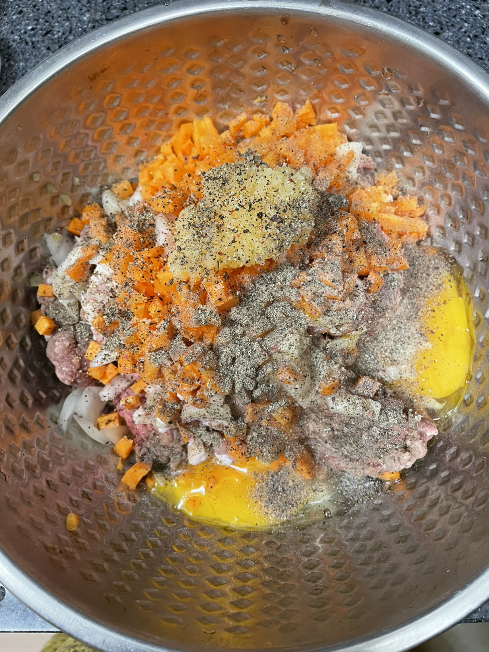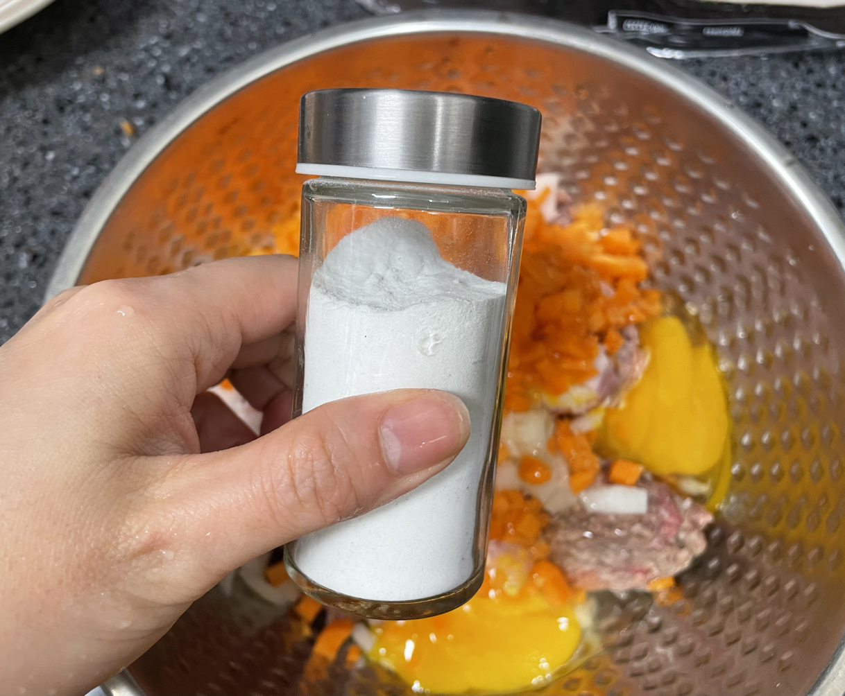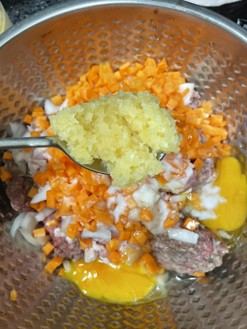 10. 생각보다 양파와 당근이 좀 큰 듯 하지만 내가 먹을거니까 괜찮다 :) 넙적하게 손으로 치대며 둥근 모양으로 모양을 잡아주고 남은 고기는 냉장보관한다. 2-3일 이내로 소진해야한다.