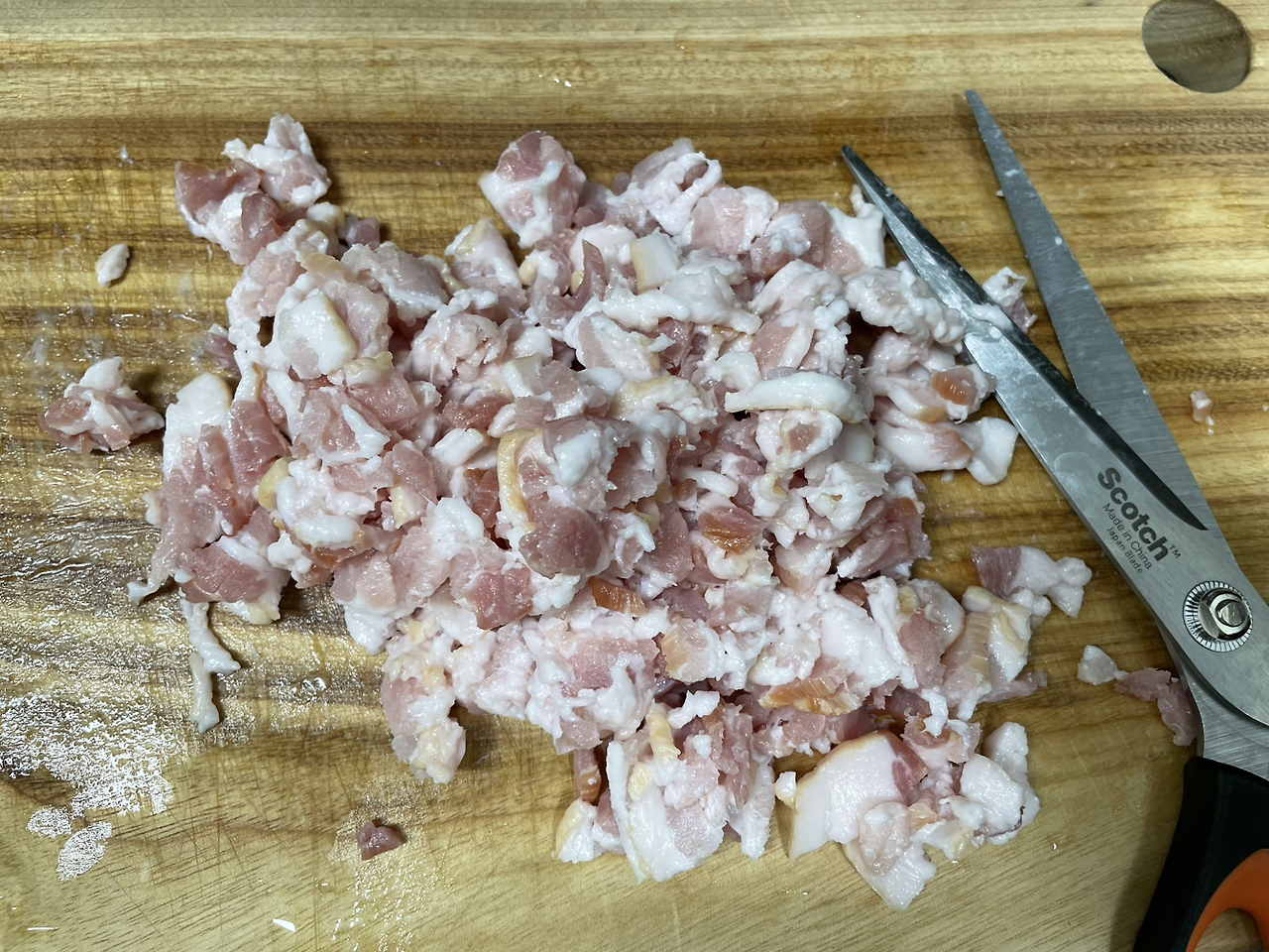 3. 베이컨을 잘게 다진다. 칼로 잘 썰리지 않으면 가위를 활용한다.