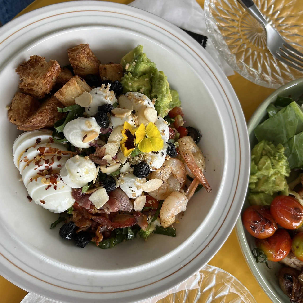 부드러운 채소 위에 푸짐히 올라가 있는 구운 새우, 아보카도, 크루통, 삶은 계란, 베이컨, 블랙올리브의 조화가 정말 좋다. 샐러드 상태가 매우 좋고 치즈와 소스의 궁합이 딱 맞다.