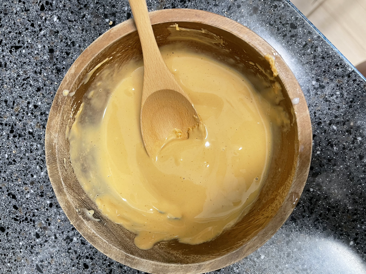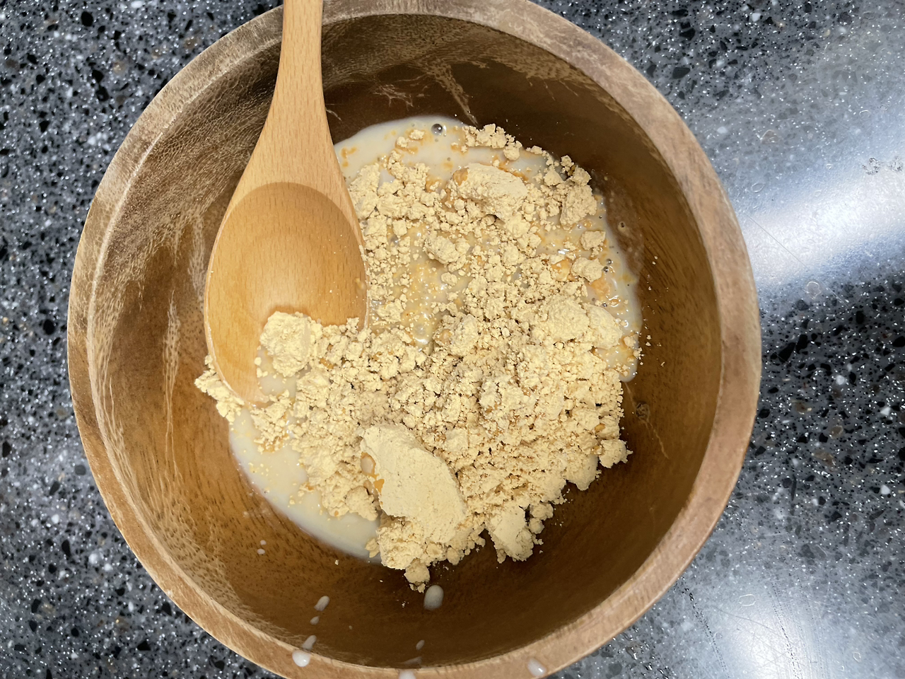 3. 그리고 두유를 처음부터 부왁 붓지 말고 천천히 조금씩 넣어 저어주며 점도를 살핀다.