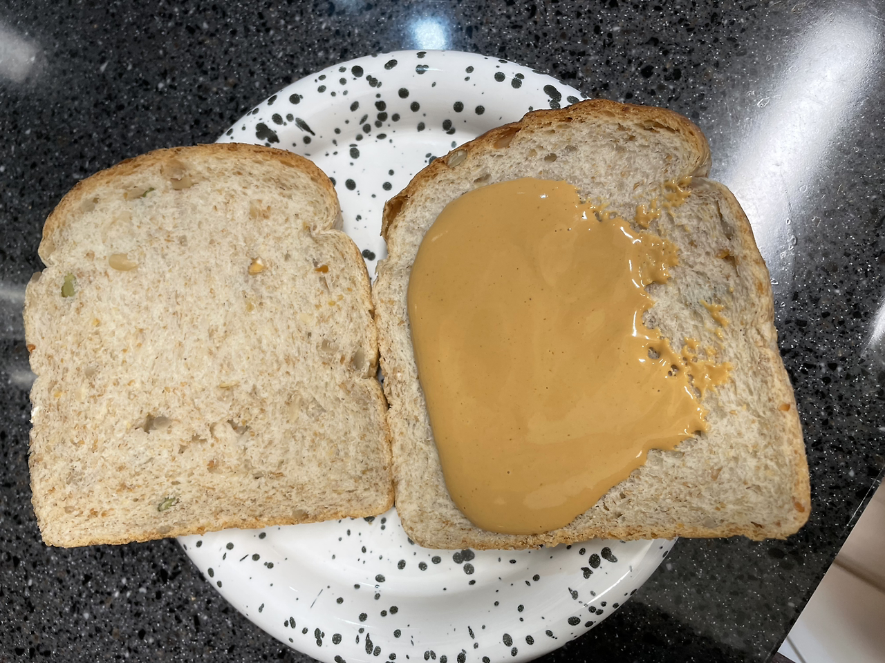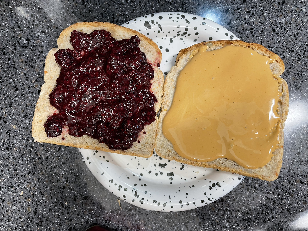 4. 식빵 두 장을 준비한 후 한쪽에는 방금 만든 땅콩 스프레드를 넓게 펴 발라주고, 다른 한 쪽에는 자신이 좋아하는 잼을 바르거나 나는 저번에 만든 치아베리 잼을 발라주었다.
