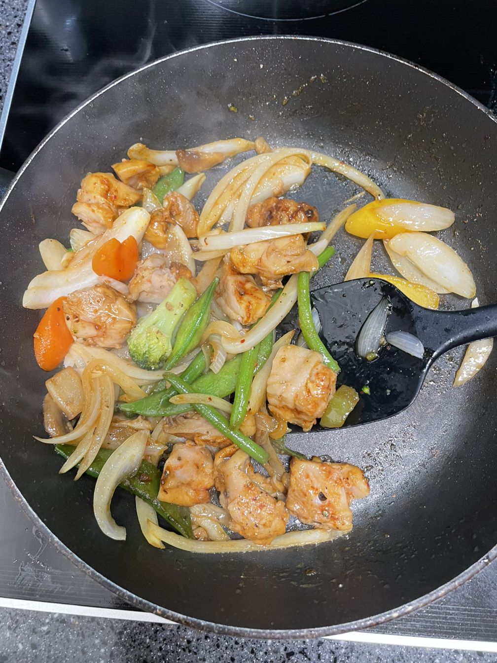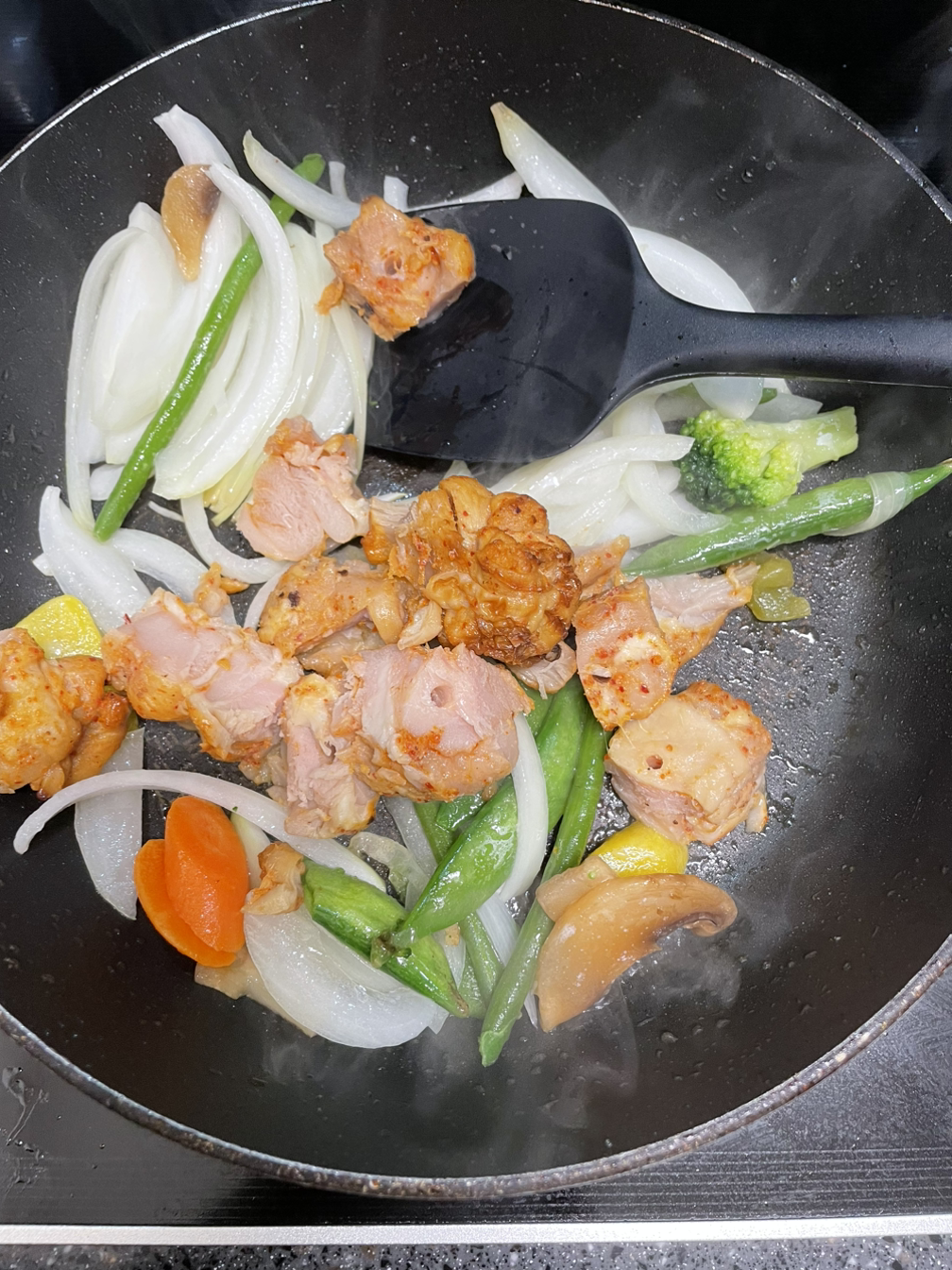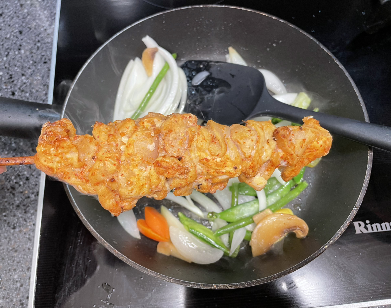 3. 미리 해동시켜놓은 닭꼬치 하나를 꺼내 알맞게 잘라 넣어준다. 개인적으로 이 닭꼬치는 양념이 여러모로 부족해서 그냥 단독을 데워 먹기엔 맛이 한참 부족한 느낌이 드는데 이렇게 조리해서 먹는게 훨씬 나을 것 같다.