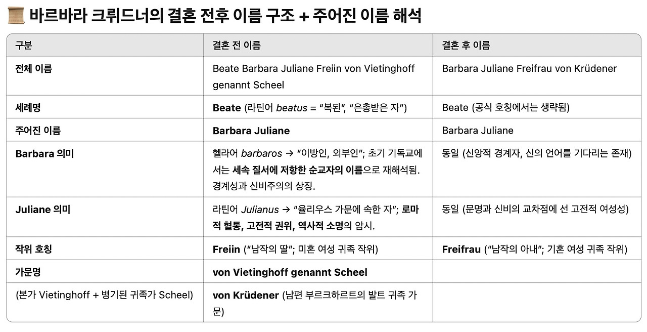 그래서 'Baroness Krüdener'는 단순한 별칭이 아니라, 남편의 독일 귀족 작위를 영어로 번역한 호칭이다.