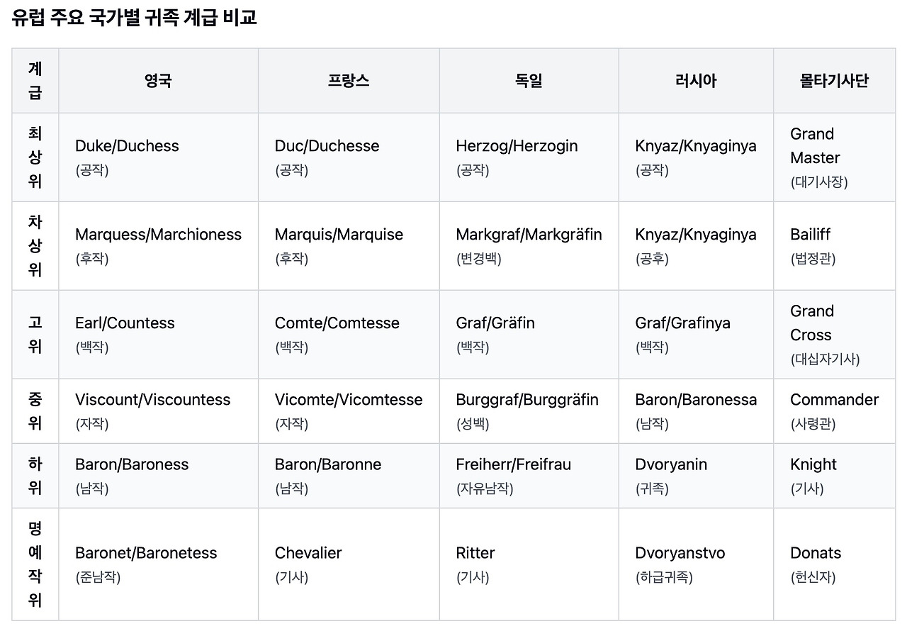 (1) 프랑스: 혁명 이전에는 Duc(공작), Marquis(후작), Comte(백작), Vicomte(자작), Baron(남작) 등의 체계가 있었으며, 혁명 이후 법적으로 폐지되었으나 문화적으로는 계속 사용됨