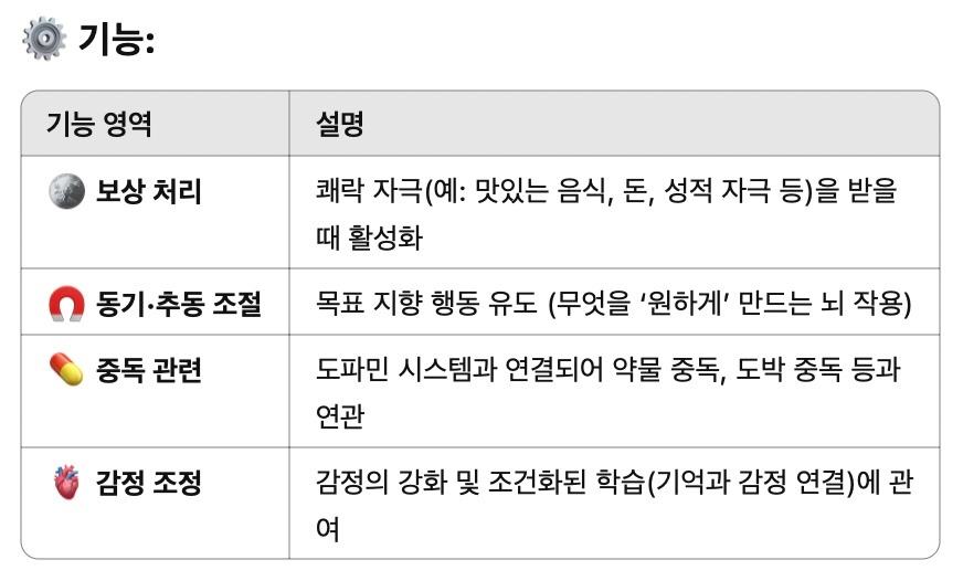 전두엽 하부 근처, 시상하부(hypothalamus)와 편도체(amygdala) 사이 연결 축에 위치하며, 뇌의 ‘보상 회로(reward circuit)’의 중심 노드