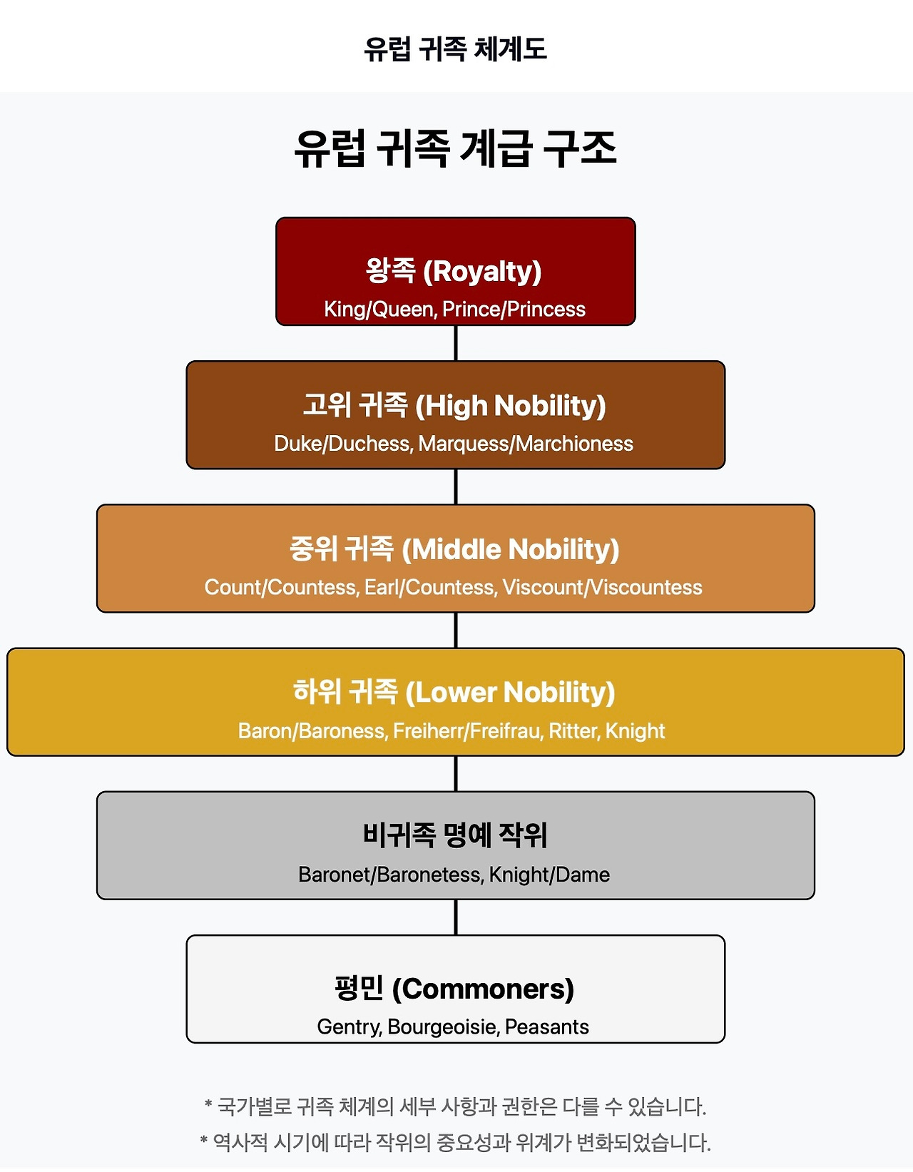 유럽의 귀족 체계는 마치 거대한 바다와 같다. 표면은 평온해 보이지만, 그 깊은 곳에는 역사의 조류와 권력의 파도가 숨 쉬고 있다. 이 글은 하나의 호칭이 품고 있는 언어적 계보, 역사적 맥락, 정치적 관계, 그리고 유럽 각국의 신분 체계라는 네 가지 차원을 탐구한다.