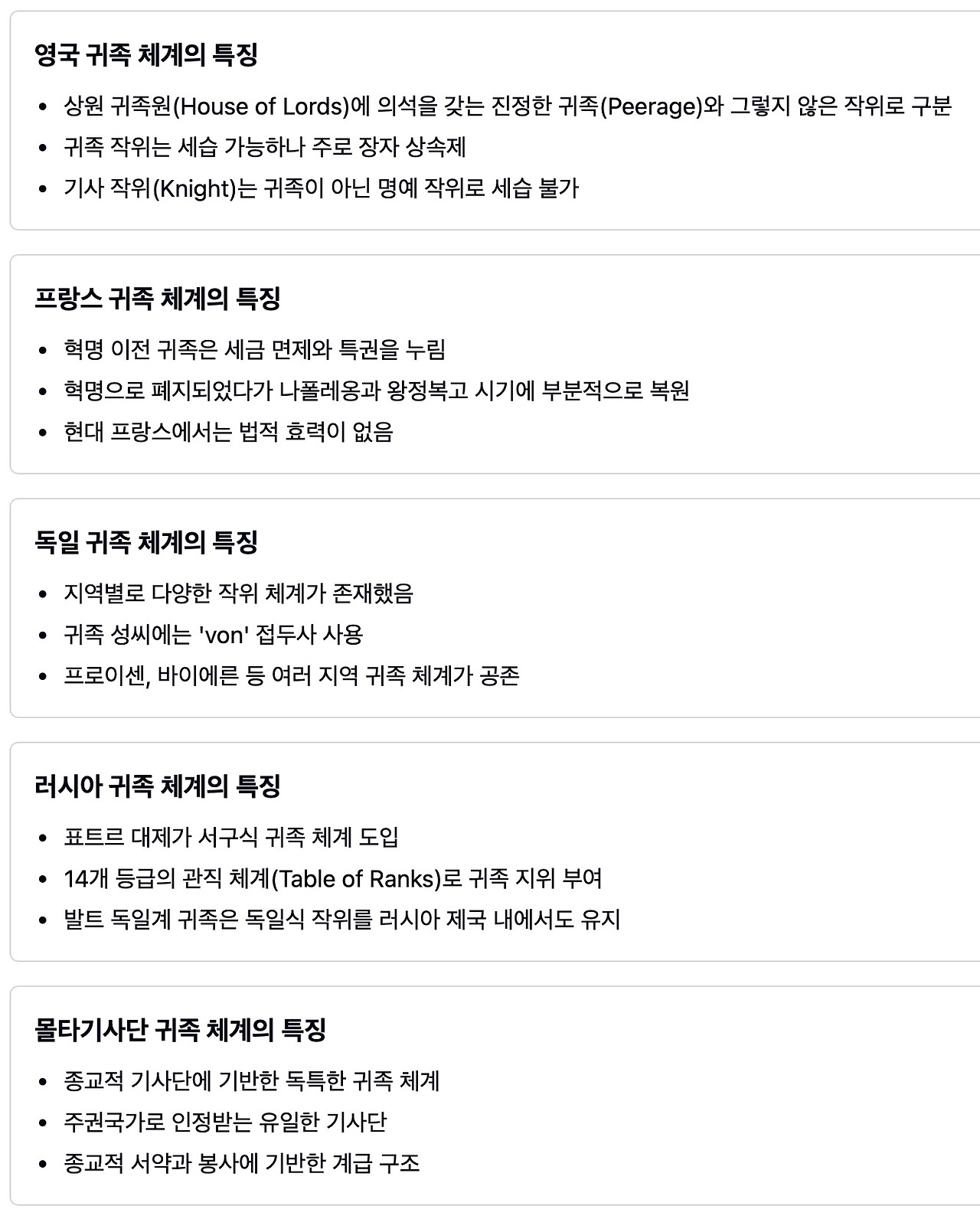 유럽 각국은 독자적인 귀족 체계를 발전시켰으며, 이는 그 나라의 역사와 정치적 맥락을 반영한다: