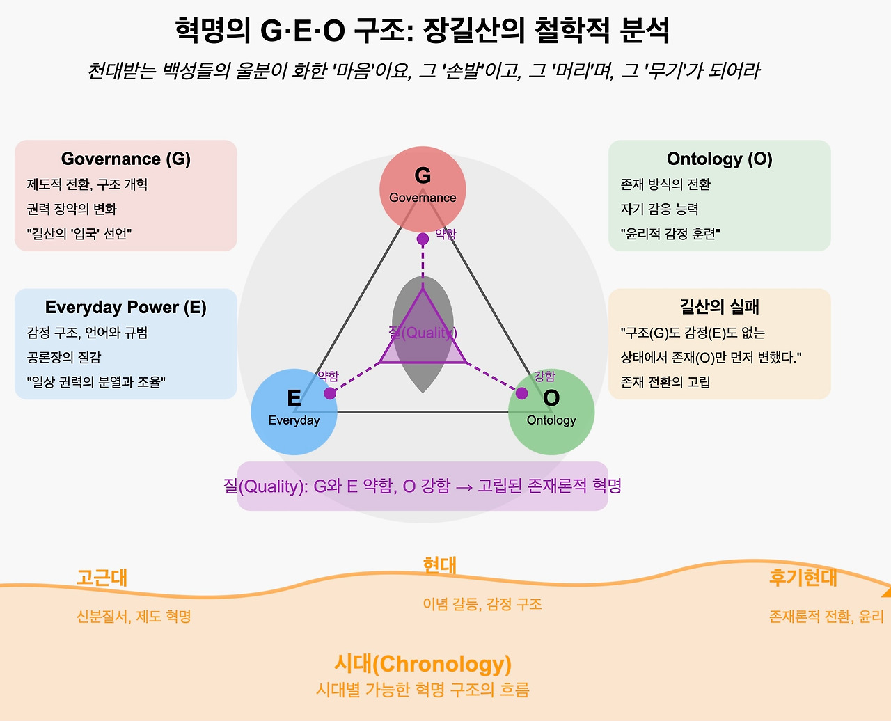 - G (Governance): 길산의 ‘입국’ 선언은 새로운 제도적 질서를 상상했으나, 구체적 설계로 나아가지 못했다. 제도는 존재하지 않았고, 정치적 상상력의 구조만 있었다.