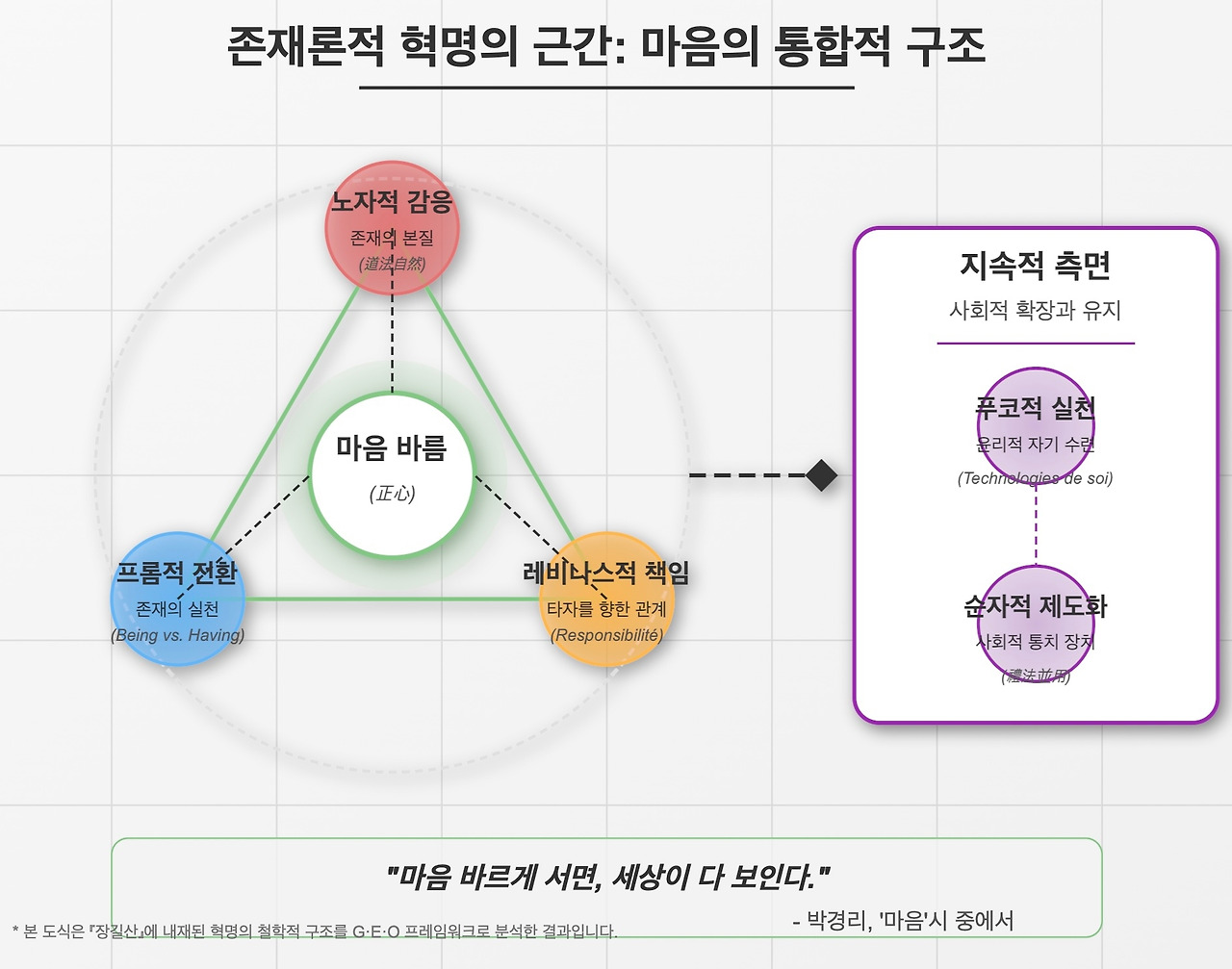 ‘바른 마음’은 노자적 감응의 본질, 프롬적 전환의 실천, 레비나스적 책임의 관계로 구성된 삼중 구조다.