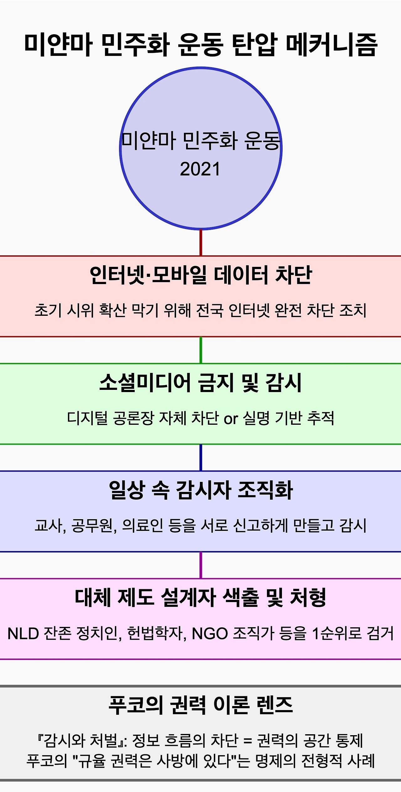 감시와 규율을 통해 몸을 통제하고 공간을 장악한다. 미얀마 군부는 시민들의 움직임을