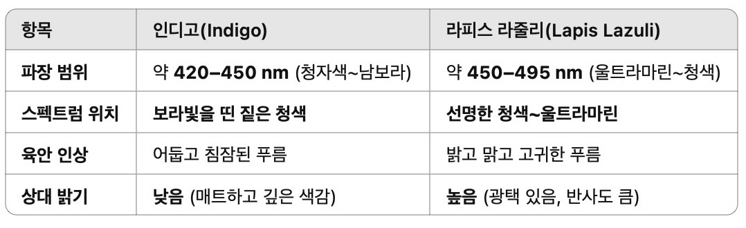 인디고의 산화 농도나 천 위 염색 상태, 라피스 안료의 채광/광택 조건에 따라 중간 스펙트럼에서 시각적으로는 유사하다.