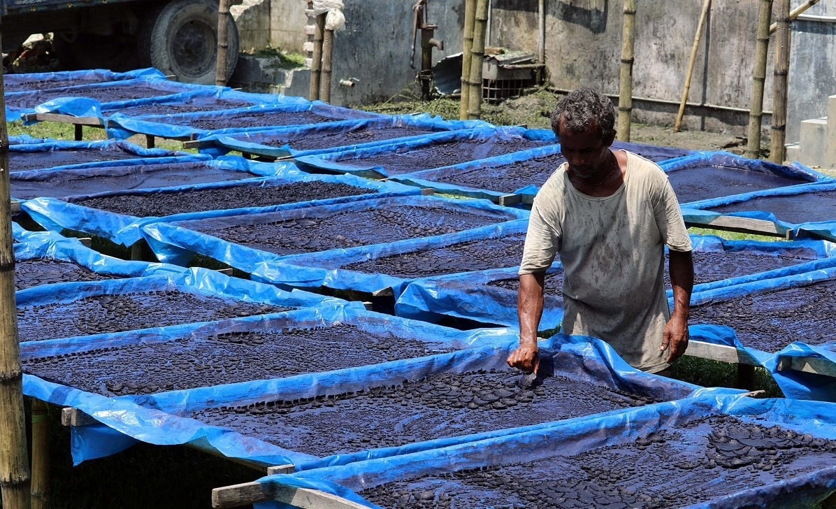 이 색을 얻기 위해 사람들은 손으로 잎을 비벼 발효시키고, 침전시키고, 건조하고, 섬유에 물들였다.