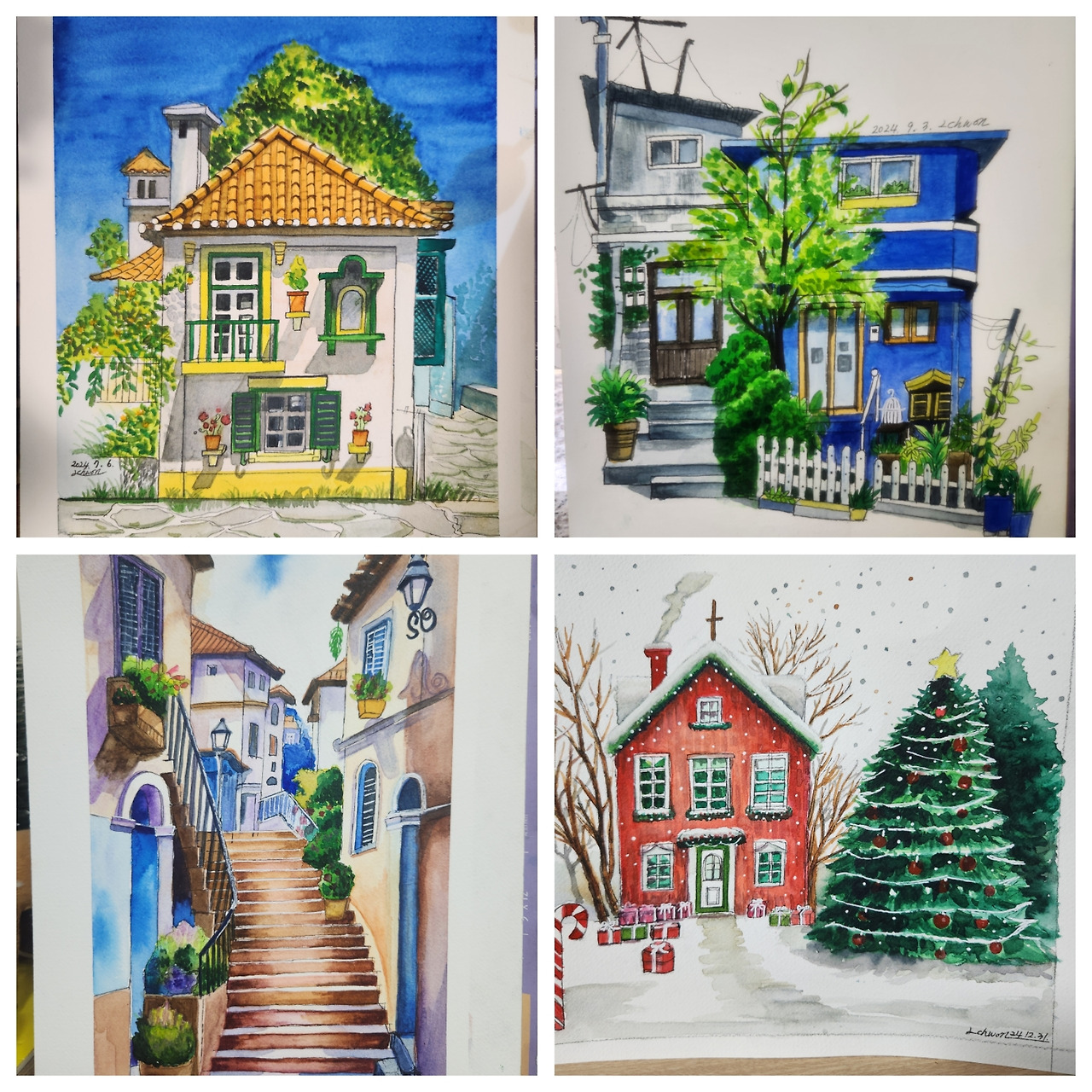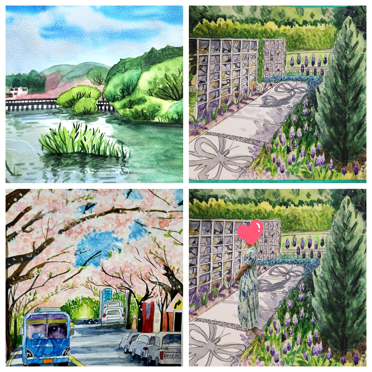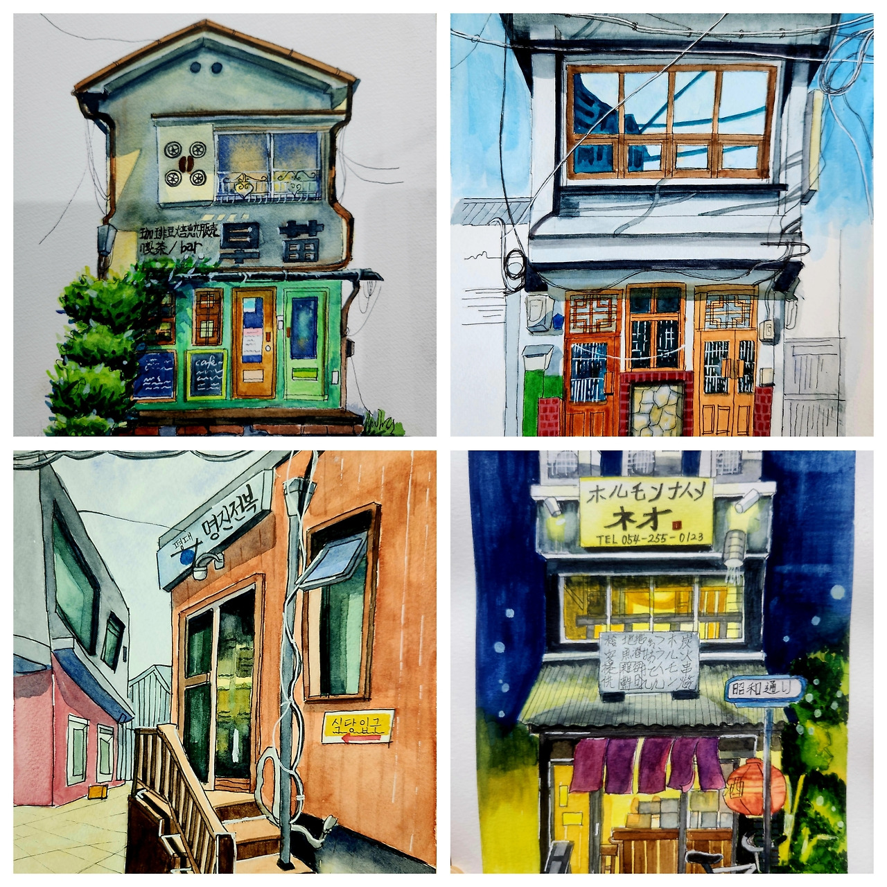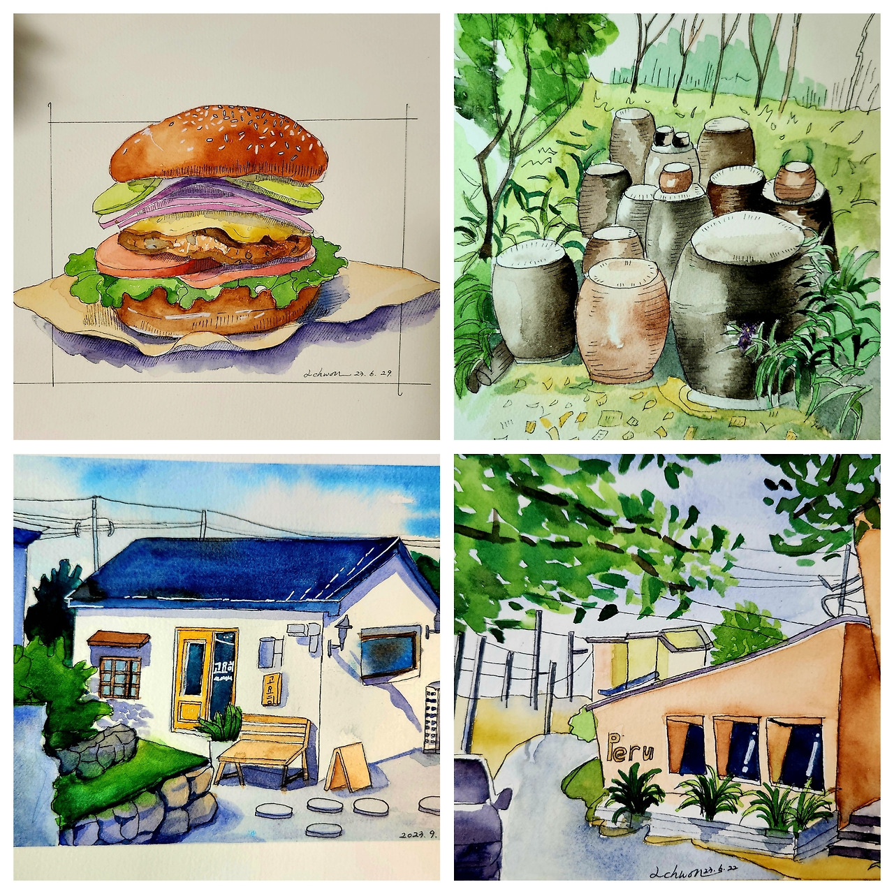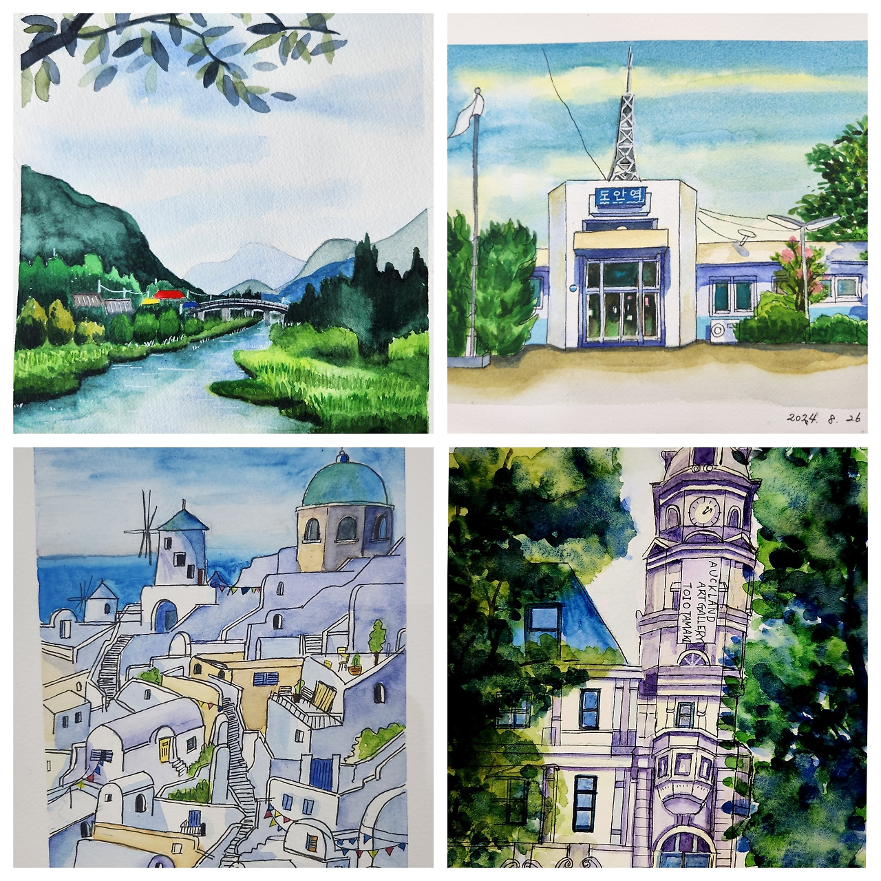 그림은 강사님이 어반스케치팀도 이끌고 계셔서 직접 찍은 사진이나 인터넷에 구하신 풍경 사진을 그리는 것인데 A4용지 사이즈 이상을 그리지 않는다. 그 이유는 큰 그림은 오랜 시간이 걸리고 그러다 보며 취미가 다시 일이 되고 스트레스가 되기 때문이다.