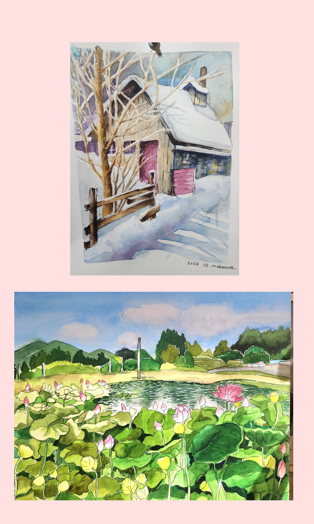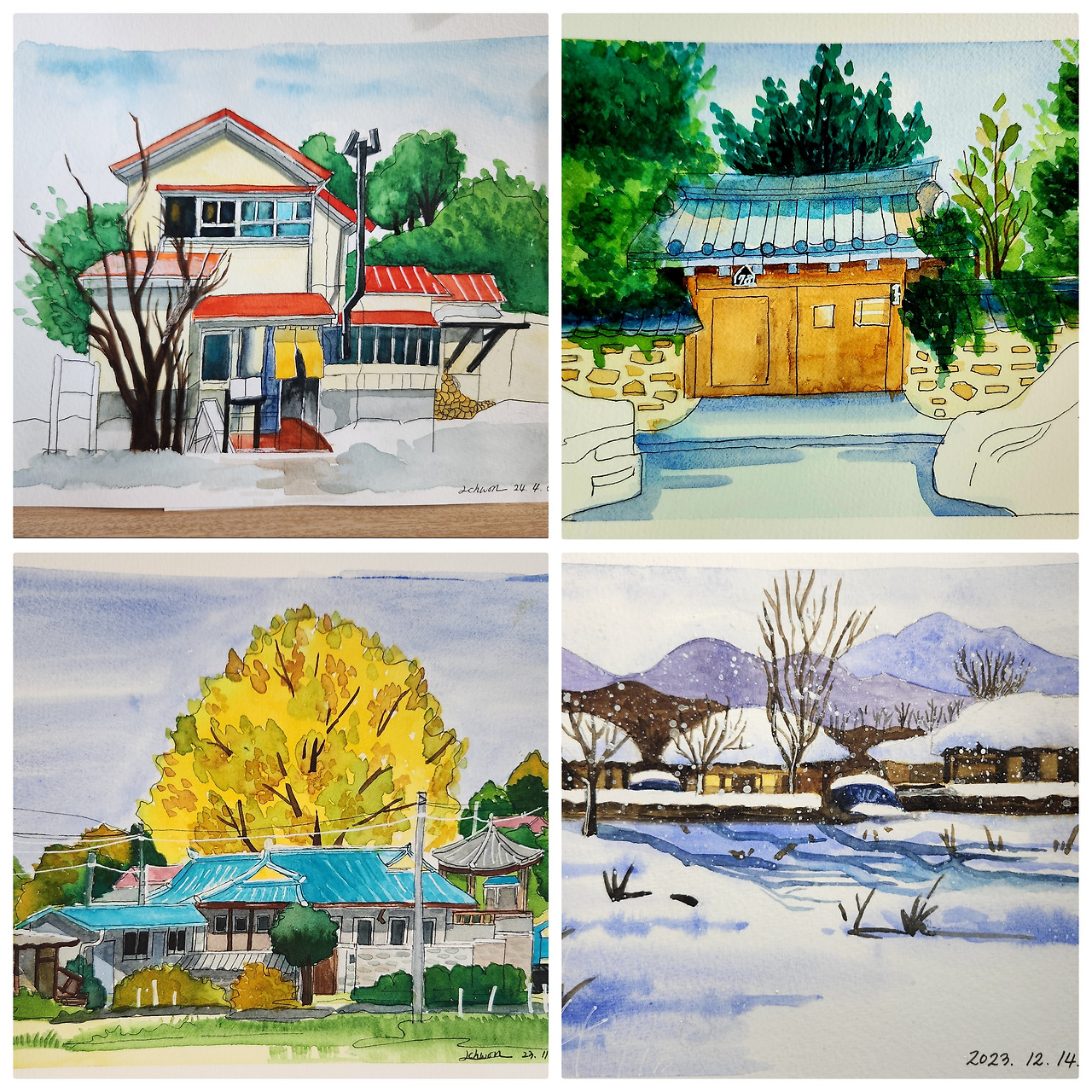 수채화 강사님이 매주 화 방문하시어 2시간 동안 지도해 주셨고 직장 내 행사가 있는 때를 빼면 2년간 모두 출석률이 우수했다. 사실 4명의 수강료를 모아도 강사님 한 달 기름값 정도밖에 안 되는 거 같은데 인품이 훌륭하신 강사님이 우리의 열정을 예뻐해 주셔서 적은 수강 인원에도 비가 오거나 눈이 오나 화요일마다 방문해 주셨다. 희한하게 강사님 오시는 날만 비가 퍼부었고 어느 날에는 절대 안 늦으시는 분이 시간이 지나도 안 오셔서 보니 역시 비가 억수같이 퍼붓는 날이었다. 가방까지 다 젖은 채 헐레벌떡 오신 강사님의 가방을 닦아드리며 얼마나 송구스러웠는지 모른다. 그래서 그런지 지역 내 기여도가 인정받아 2023년에는 청주시민상도 받으셨다. (실력과 인품이 최고이신 이문숙 선생님 존경합니다.)