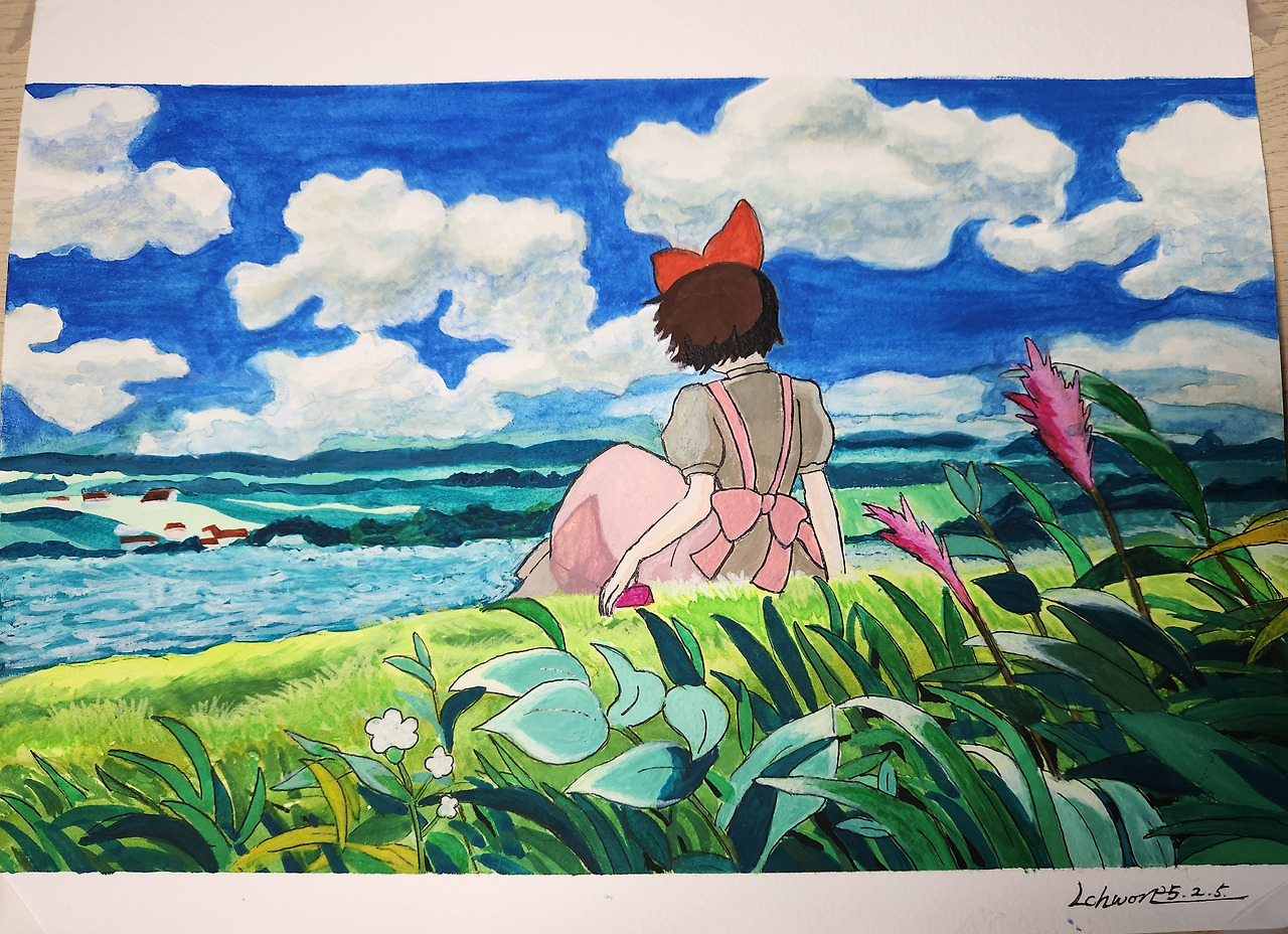 평소 안 해보았던 애니메이션 그림을 선택했고, 과슈물감(불투명수채물감)도 구입하여 주 2회씩 1시간씩 어떤 때는 스케치만 하고, 어떤 때는 사람 옷만, 어떤 때는 풀잎만, 어떤 때는 구름만 색칠하고 왔더니 3주 만에 완성했다.
