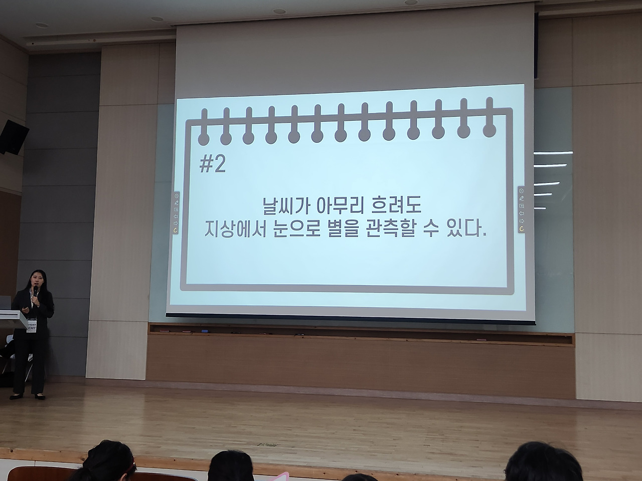 행사 현수막은 강당 안에 있었다. 행사 시작 전 부스에서 천문대생들에게 오늘 일정표와 경품추첨번호를 들고 강당으로 들어갔습니다. 반갑게도 둘째 아이의 친구 가족도 와 있어 반갑게 인사를 나누었습니다. 낮에 행사는 많이 가 보았는데 밤에 만나니 뭔가 신선하고 설레는 느낌이 들었습니다.