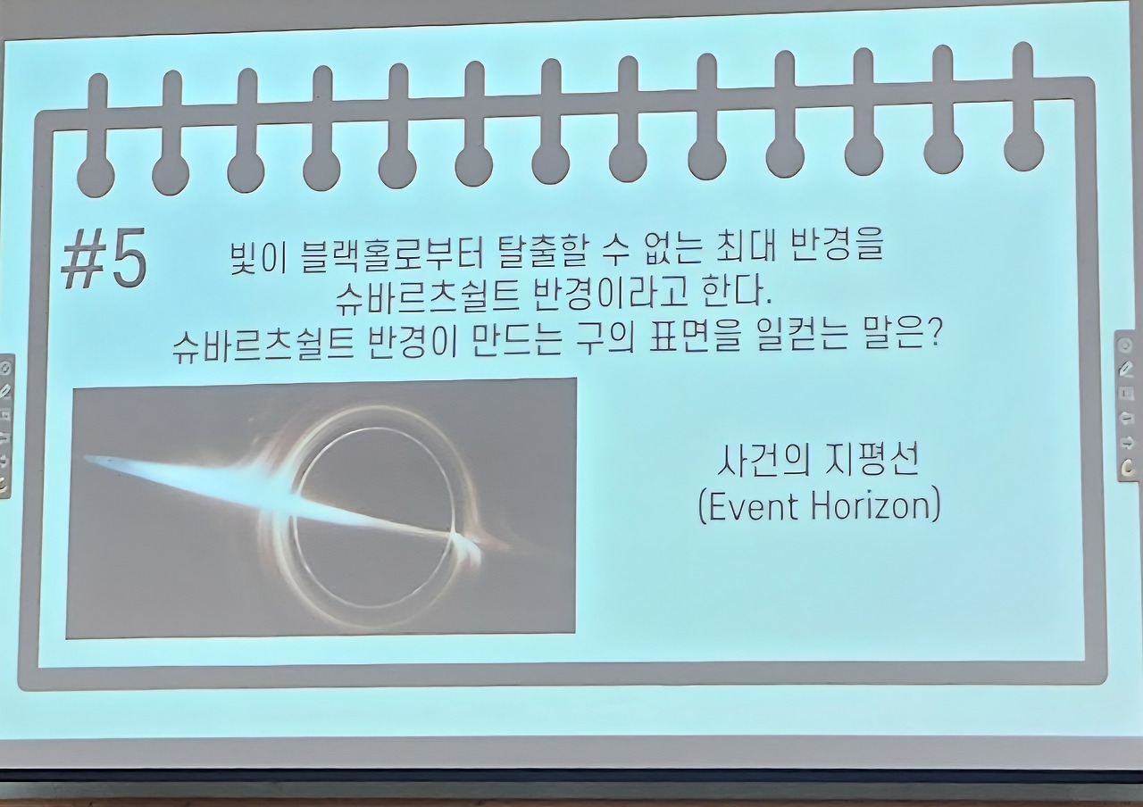그런데 저 아래 사진 중 아래에서 두 번째가 5문제 맞힌 일반인 분들의 우열을 가리기 위한 왕중왕전 문제였는데 저 어려운 문제를 맞힌 분들이 두 분이라는 것에 놀랐습니다. 정답이 제가 좋아하는 윤하의 '사건의 지평선'이었는데 저는 그런 뜻이었는지 꿈에도 몰랐습니다. ^^ 이걸 맞추신 분들은 평소 우주에 대해 관심이 진심이라고 느꼈고, 공부는 평생 해야 된다고 느끼며 저를 겸손하게 만들었습니다.