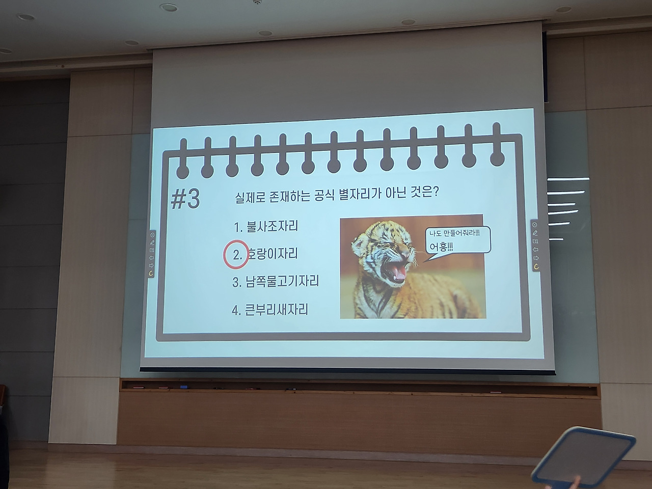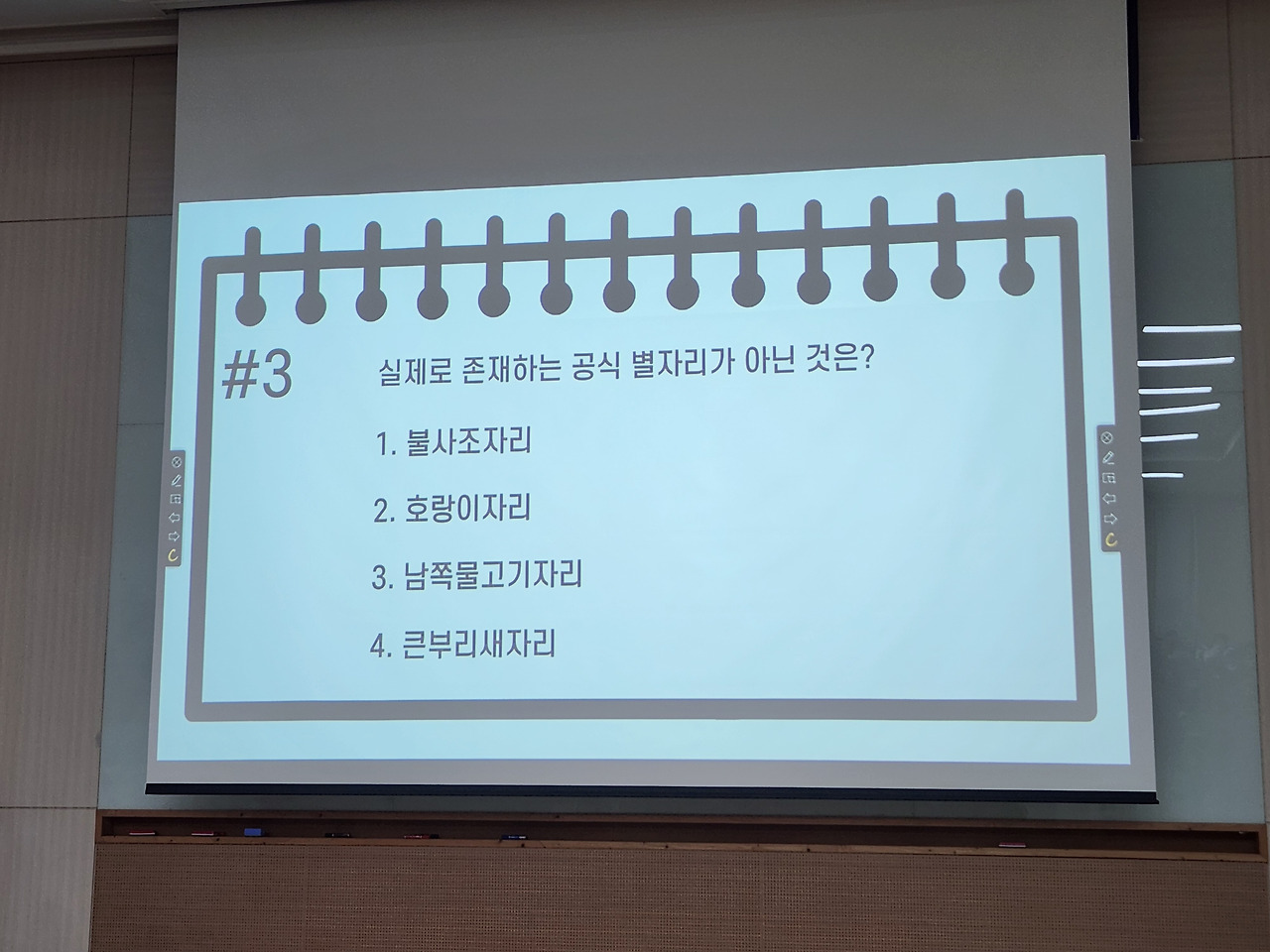 토성을 관측하고 다시 강당으로 모여 초등학생, 일반인과 중고등학생 나누어 골든벨을 하였습니다. 우리 아이는 3번까지는 통과했으나 난이도가 높아지니 탈락, 저도 그런 식으로 뒷문제에서 아쉽게 탈락하였습니다.