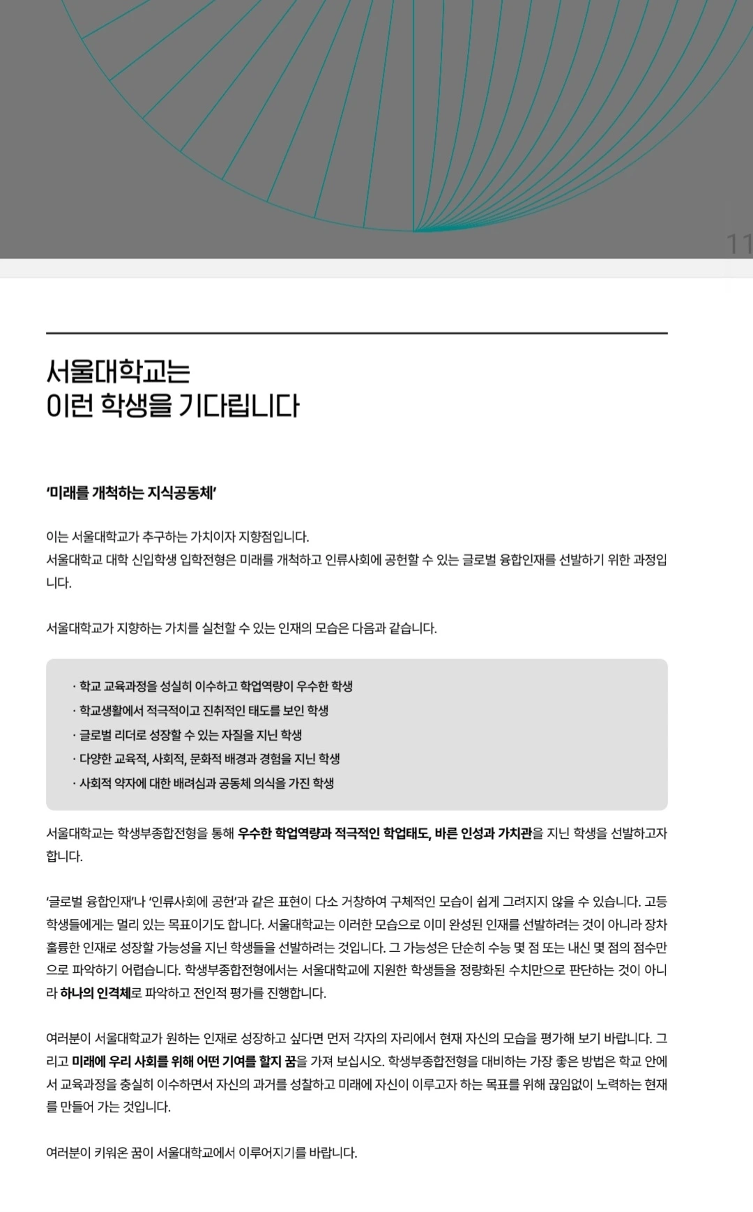 ※ 상훈이 사례도 2023년 입시 이야기다. 수시로 서울대를 갔기 때문에 정보의 방향성도 그 쪽일 때가 많다. 참조는 하되 2024년 입시 방향과 지원 대학교 측에서 객관적으로 올리는 자료를 분석함으로써 선택한 정보들을 확고하게 다져나가는 게 중요하다.