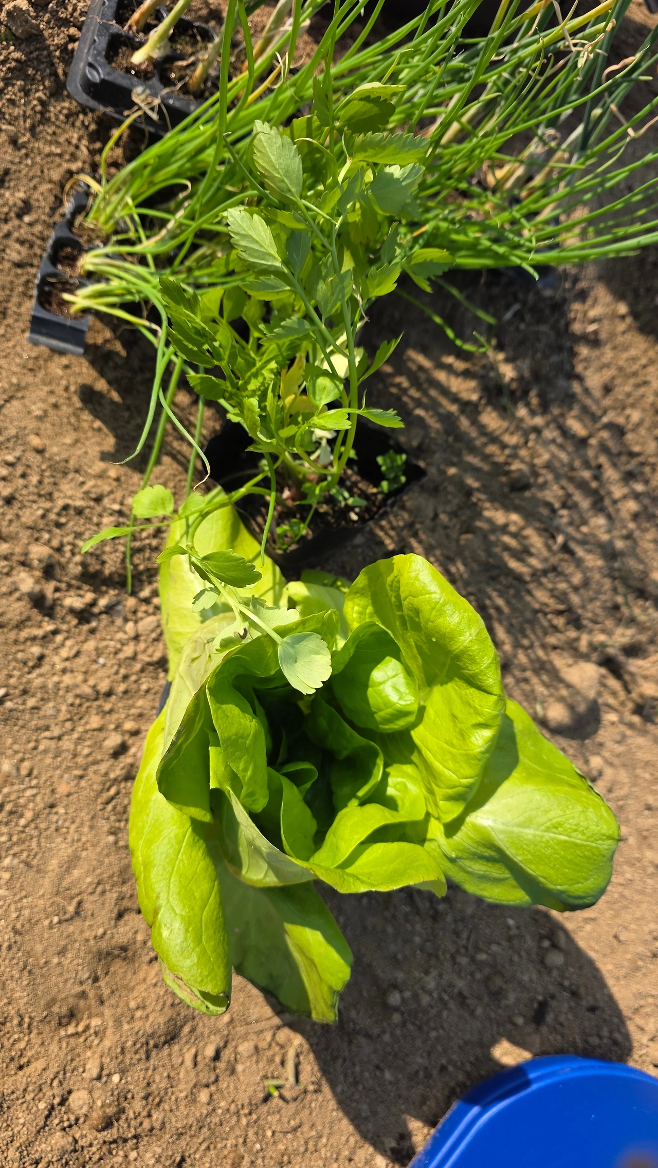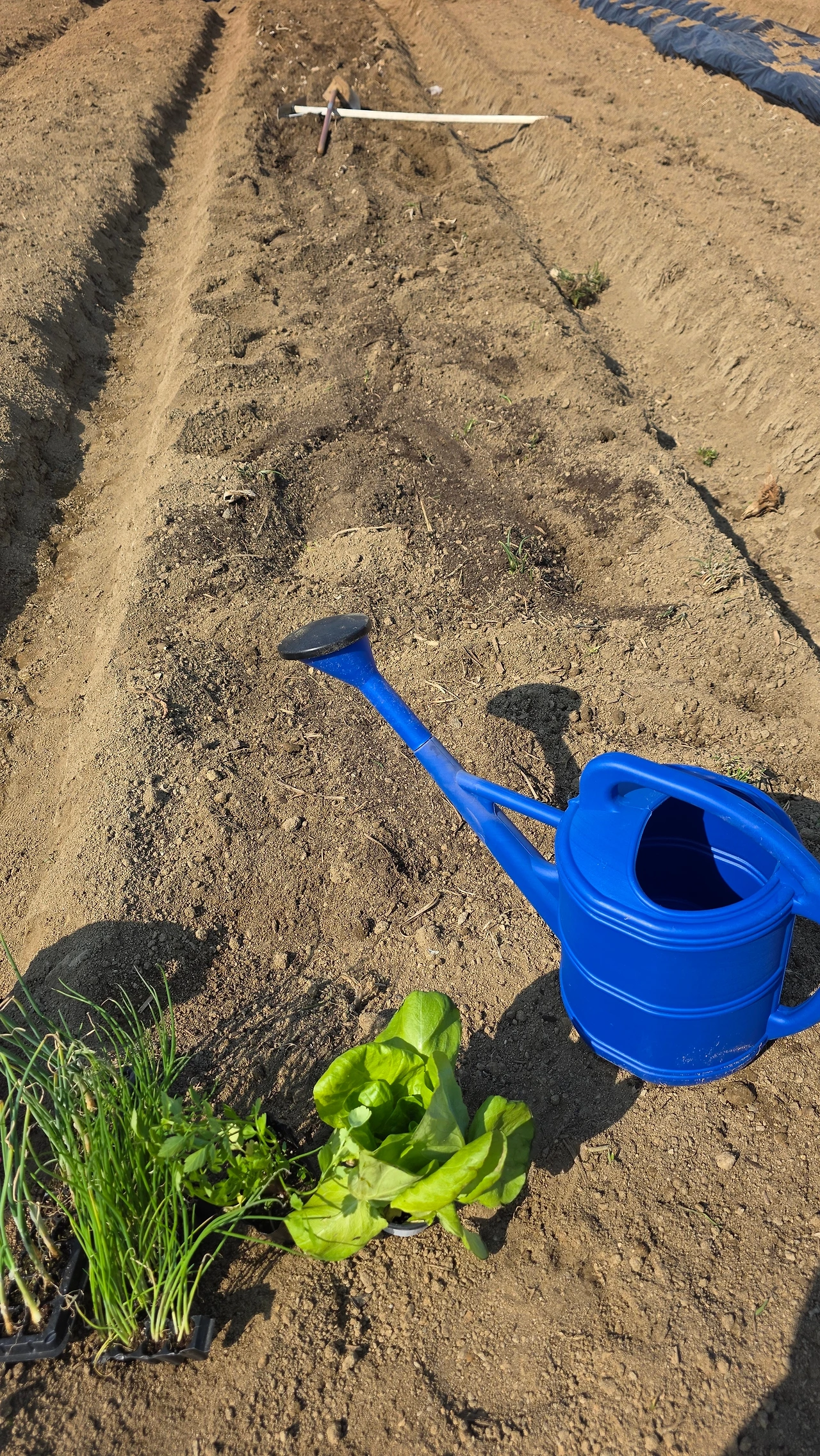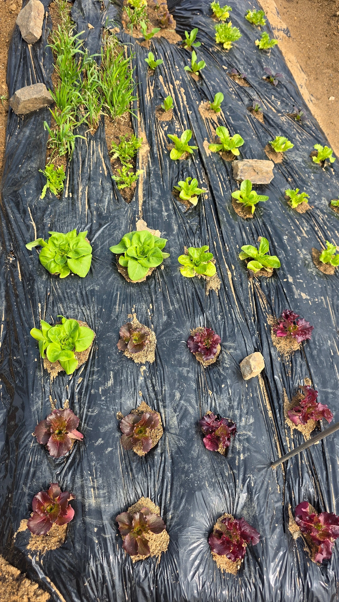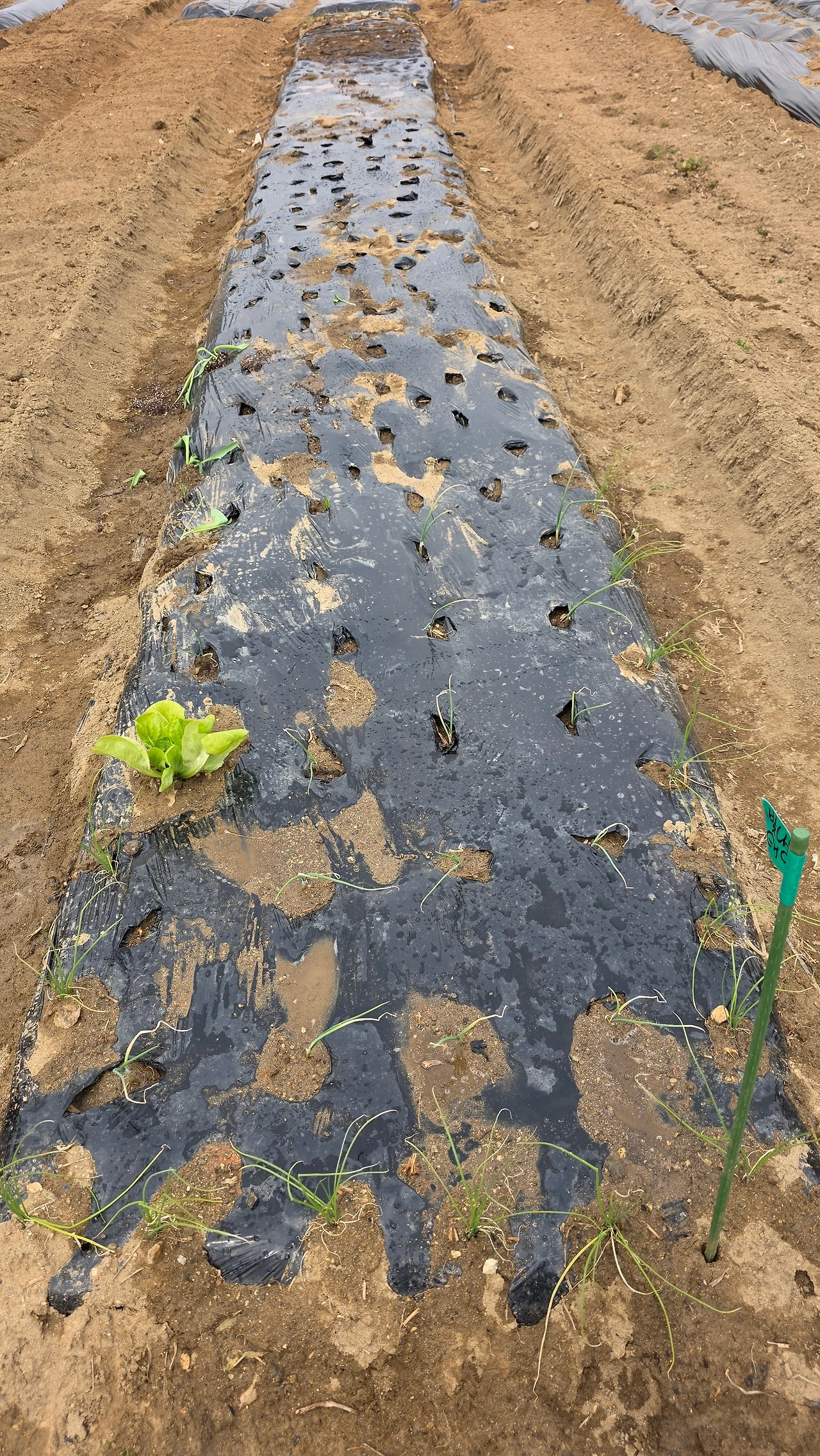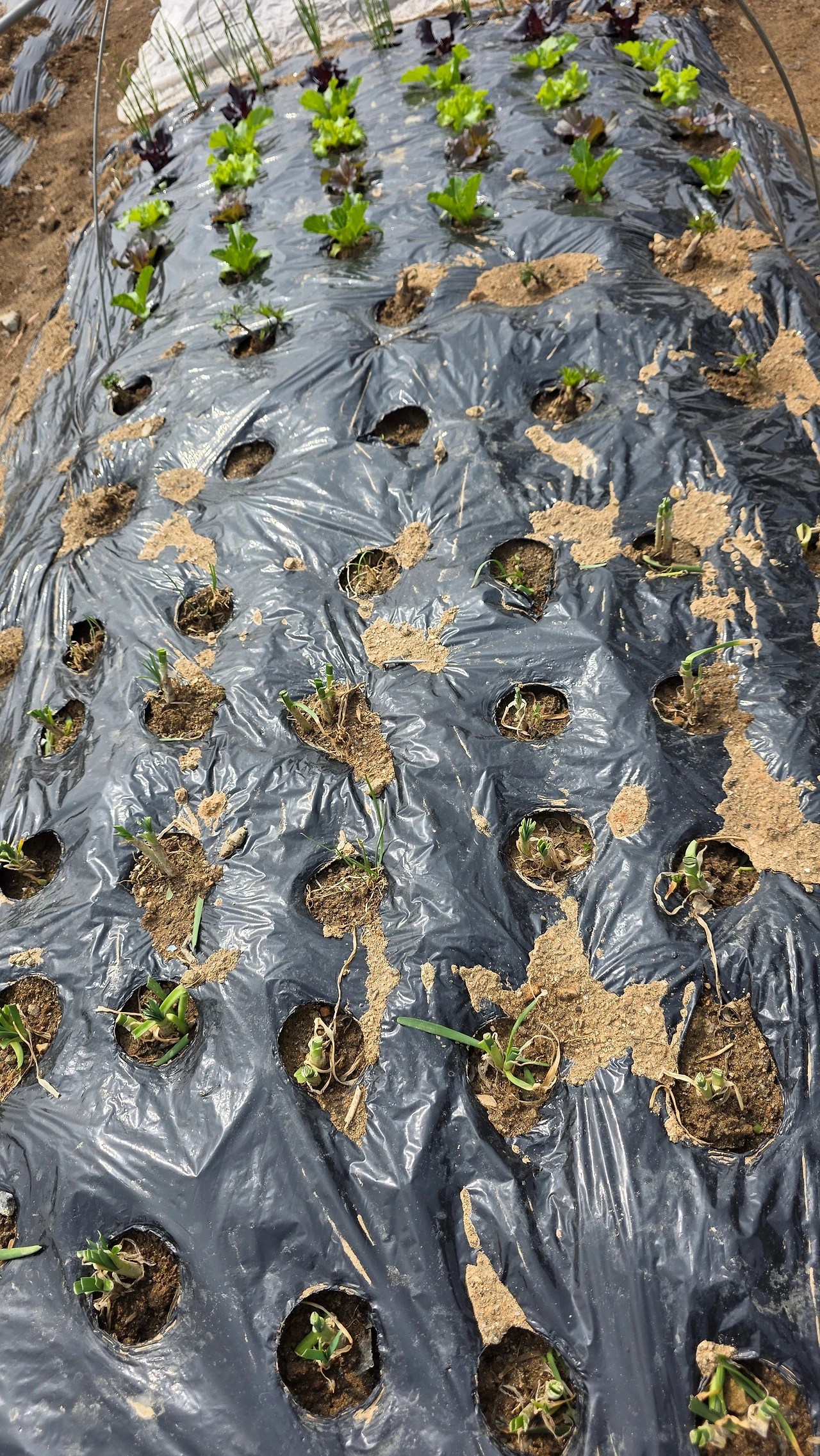 3월 하순에 심을 수 있는 양파모종과 대파모중을 심었다. 아삭해 보이는 상추는 덤으로 얻었다. 3월 말에 심을 수 있는 상추씨앗과 부추씨앗, 쑥갓 씨앗을 대충 뿌렸다. 말이 대충이지 멀칭 비닐에 구멍을 뚫어 가면서 심는 것이 쉽지는 않았다.