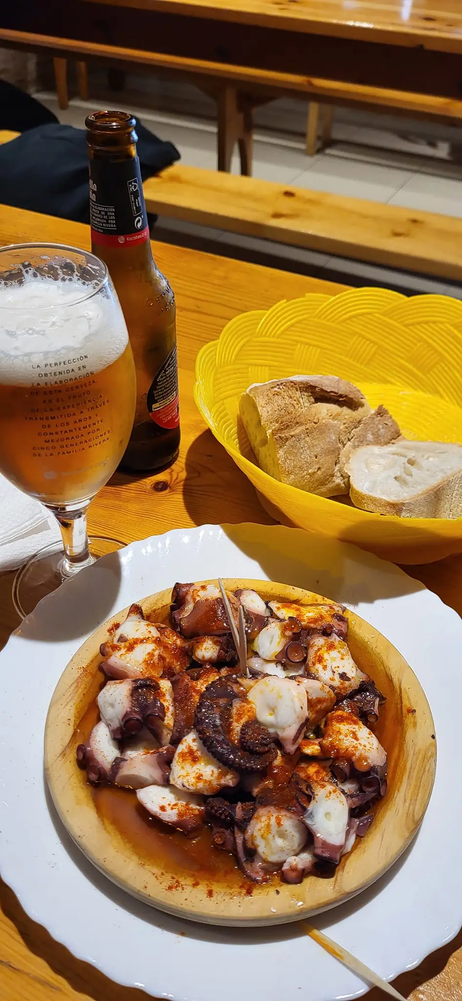Melide라는 곳에서 점심으로 갈라시아 지방의 요리 문어요리를 먹었다. 요리래 봐야 문어를 삶고 그 위에다 약간의 이름 모를 붉은 가루 소스를 친 게 전부다. 더불어 마시는 맥주나 와인이 마치 피아노의 C 건반과 D 건반을 함께 두들길 때 나는 불협화음을 듣는 기분이다.