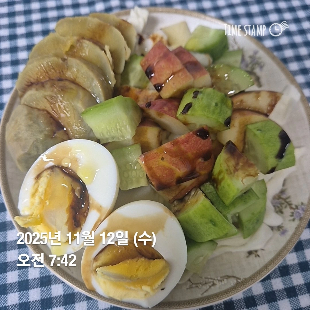 삶은 달걀, 고구마, 오이, 양배추, 사과
