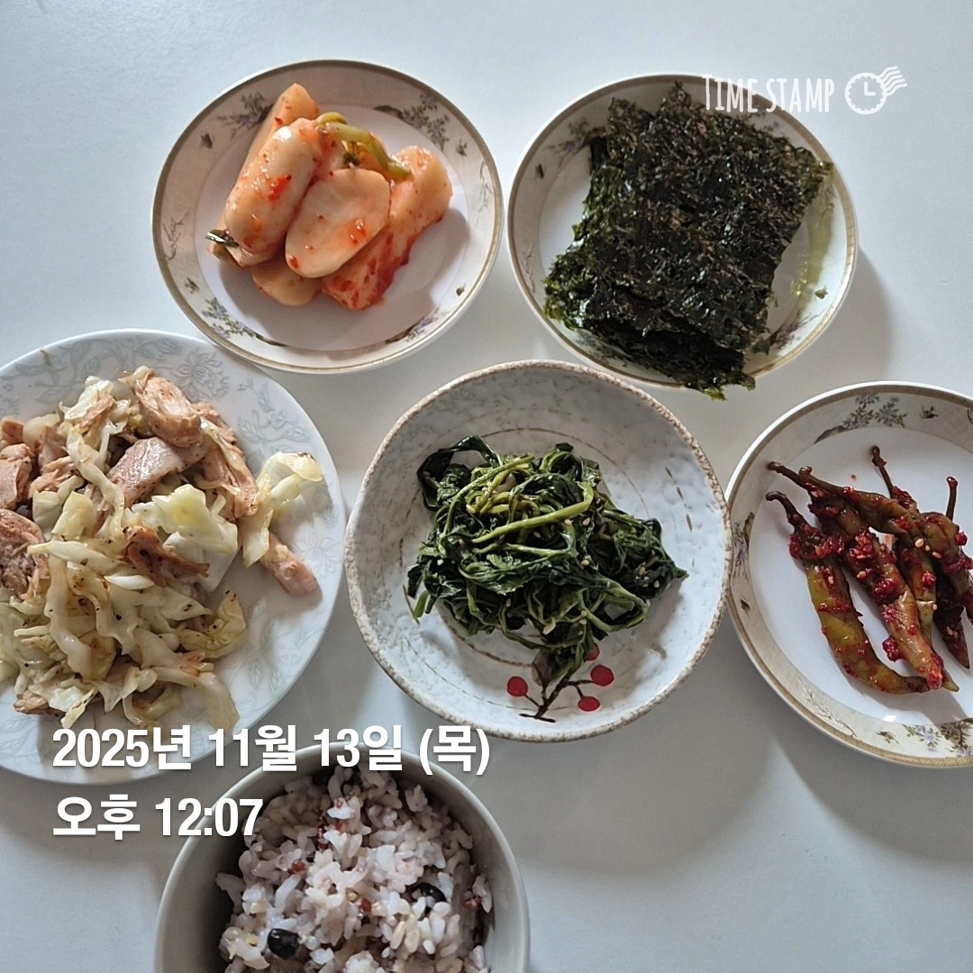 닭 가슴살 양배추 볶음. 나머지는 집에 있는 밑반찬으로 점심 먹었다.