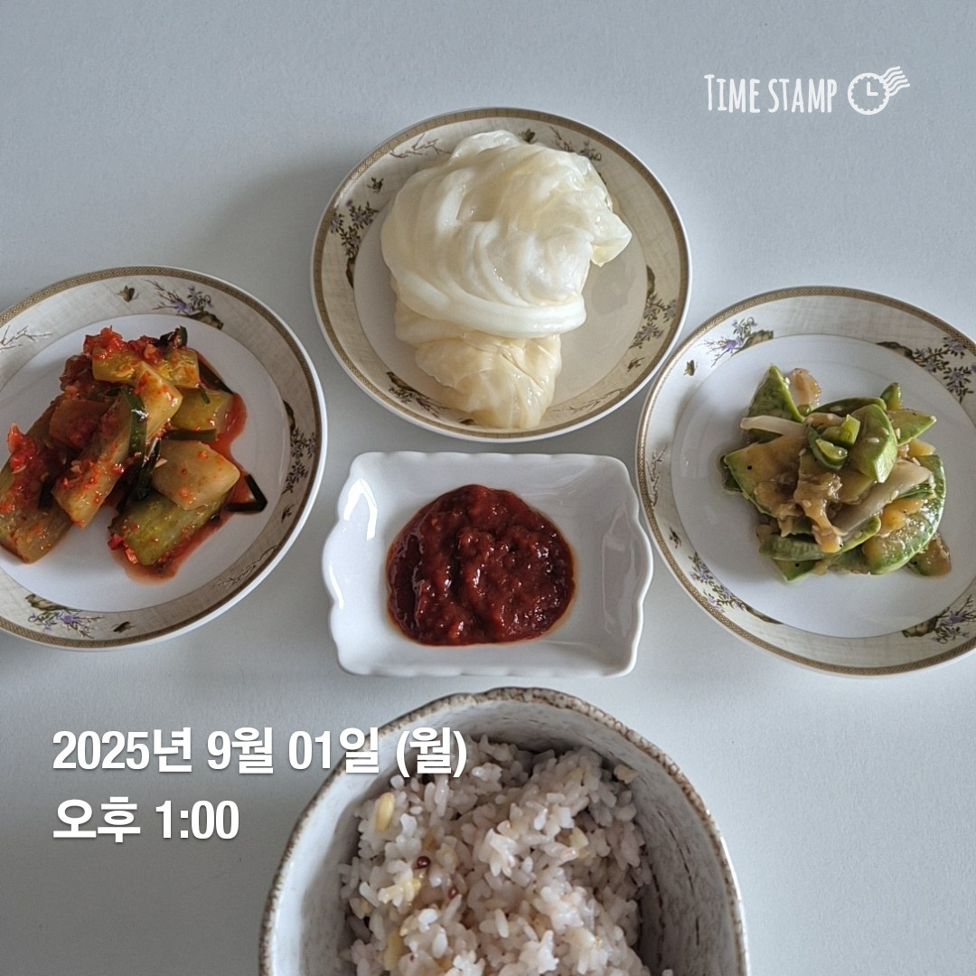 출근 전 점심은 일반식으로 간단히 차려 먹었다.(호박볶음, 오이김치, 양배추 쌈)