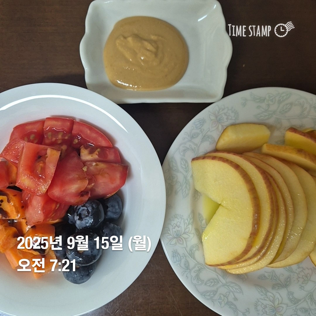 어제 시킨 땅콩버터 곁들여 사과로 아침은 든든히.