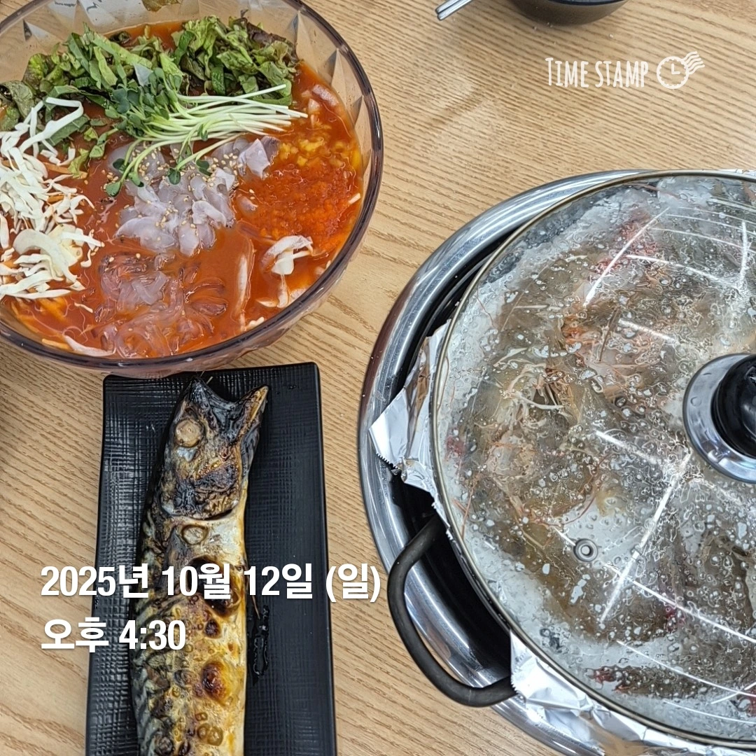 새우 500그램. 물회. 상차림으로 나온 고등어구이까지 맛있게 먹어줌