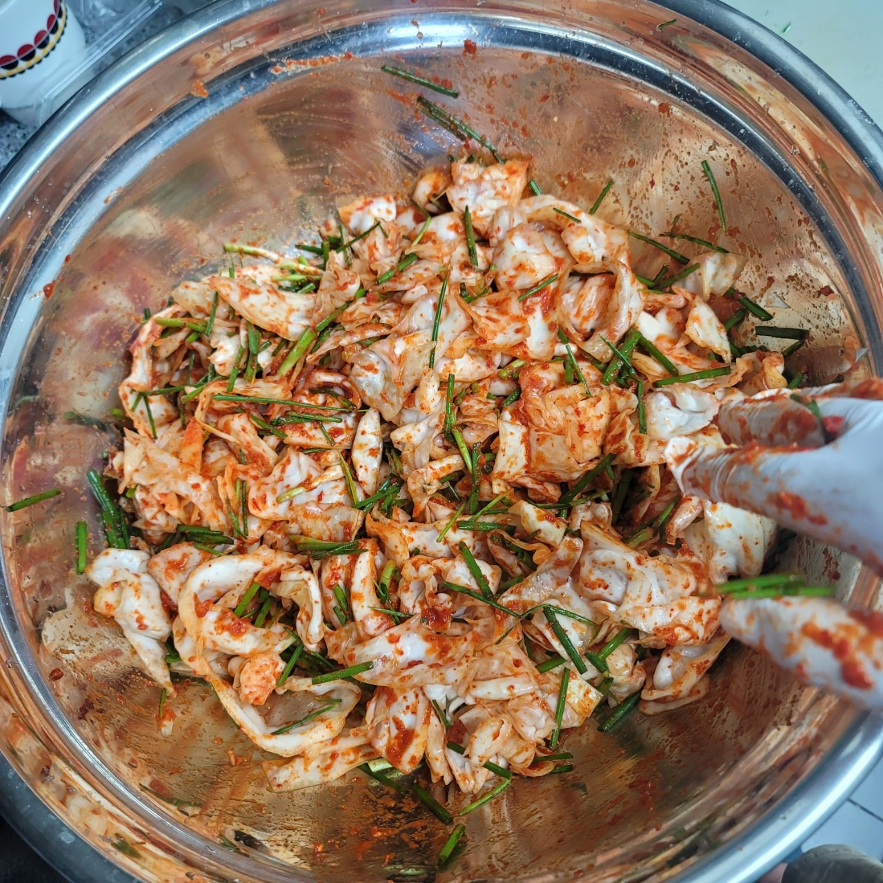 쪽파를 손가락 마디 정도 길이로 썰어서 섞고 양념과 함께 버무려주는 거야.