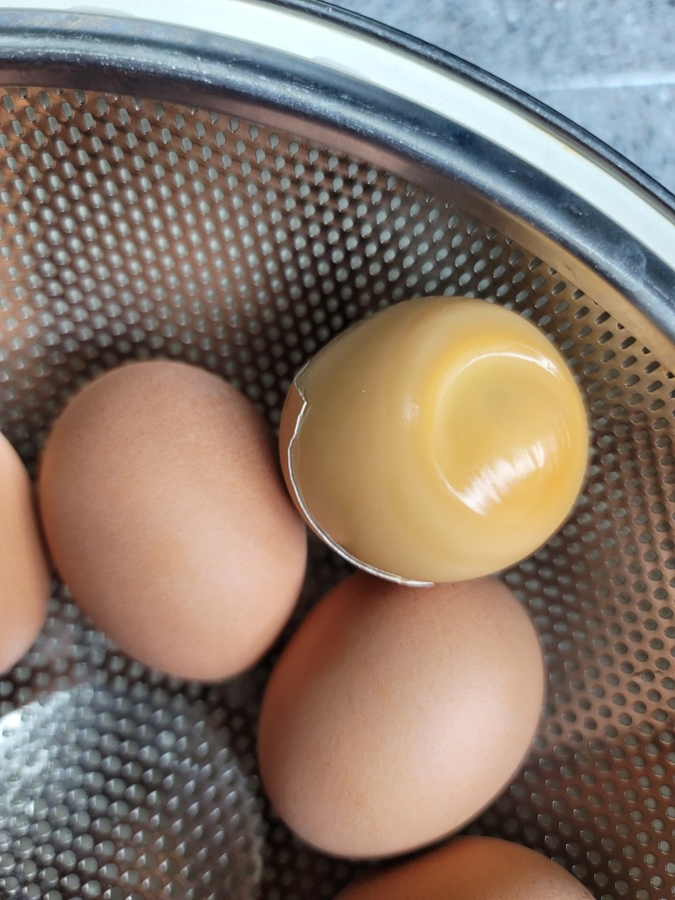그 위에 채반을 얹고, 미적지근 온수욕이 끝난 달걀을 올려.