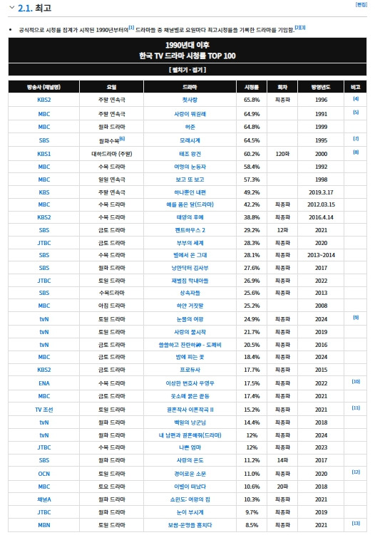과거 티브이를 가진 한국인의 65.8%가 시청했다는 드라마부터, 공식집계 역대순위에 오른 드라마를 단 한 편도 본 적이 없다.