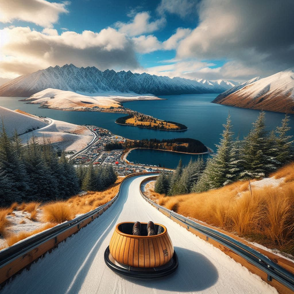 케이블카를 타고 높은 산의 정상에 올라가면, 낭떠러지 절벽 옆으로 썰매를 타는 길이 굽이굽이 굽어져있다.