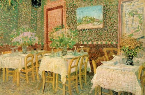 그래서 동생 테오는 형을 프랑스 파리로 불러 들여 당시의 화풍을 배우도록 배려한다. 그래서 고흐는 1886년에 파리의 '몽마르뜨 언덕'에 살면서 수많은 인상파 화가들과 교류하며 미술수업을 받게 된다. 이 시기의 그림들에서 꽃과 자기 자신을 대상으로 하는 그림들이 많이 그려진다. 그리고 대표적인 작품으로는 ‘식당 내부’와 같은 그림이 있다. 이 그림을 보면 후기 인상주의의 점묘법이 고흐의 그림에 영향을 끼쳤음을 알 수 있다.