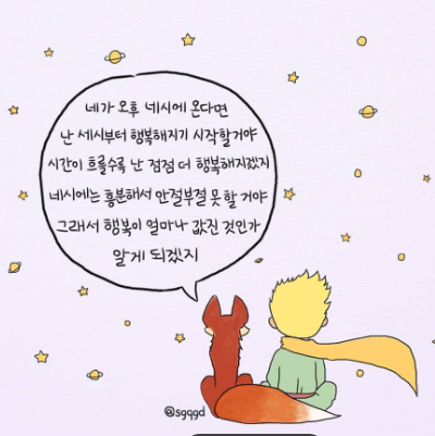 좋은 사람을 만나기 위한 기다림의 소중함을 알려준다. 이 마음을 잘 표현한 시로는 유치환의 '행복'이나 황지우의 '너를 기다리는 동안'과 같은 시가 있다. 아마 이들도 '어린왕자'에게서 사랑하는 마음과 기다림의 행복을 배운 것 아니었을까?