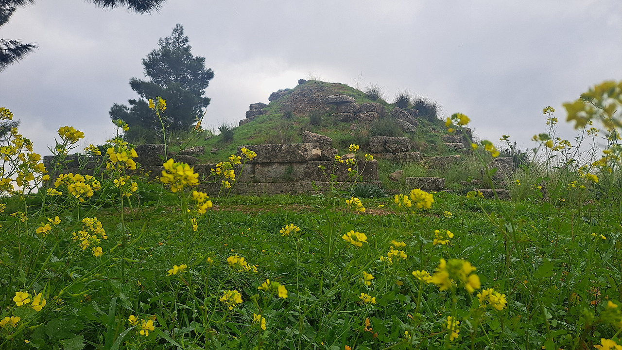 메넬라이온으로 갔다. 와 가는데. 유적지 입구부터는 과수원 비탈길인데, 길이 한국 등산로에 차 많이 지나다니면 바퀴 많이 닫는 부분만 깊게 파이는 것처럼 그렇게 돼있었다. 근데 큰 트럭 다니는 길이라 우리가 빌린 차랑 바퀴 간격도 안 맞았고, 웅덩이도 생겨 있었다. 그러니까 올라 가는데 차 밑에서 빠각 빠각 소리 나고, 막 차가 기울고 그랬다. 목숨은 여기서 진짜 걸었다. 그렇다고 중간까지 와서 빠꾸로 내려 갈 수도 없어 계속 올라갔다. 과수원 안에 돌무더기 두개가 있었다. 대신 꽁짜잖아. 이 돌무더기에는 슬픈 전설이 있다. 나는 전설 같은 거 믿지 않는다.