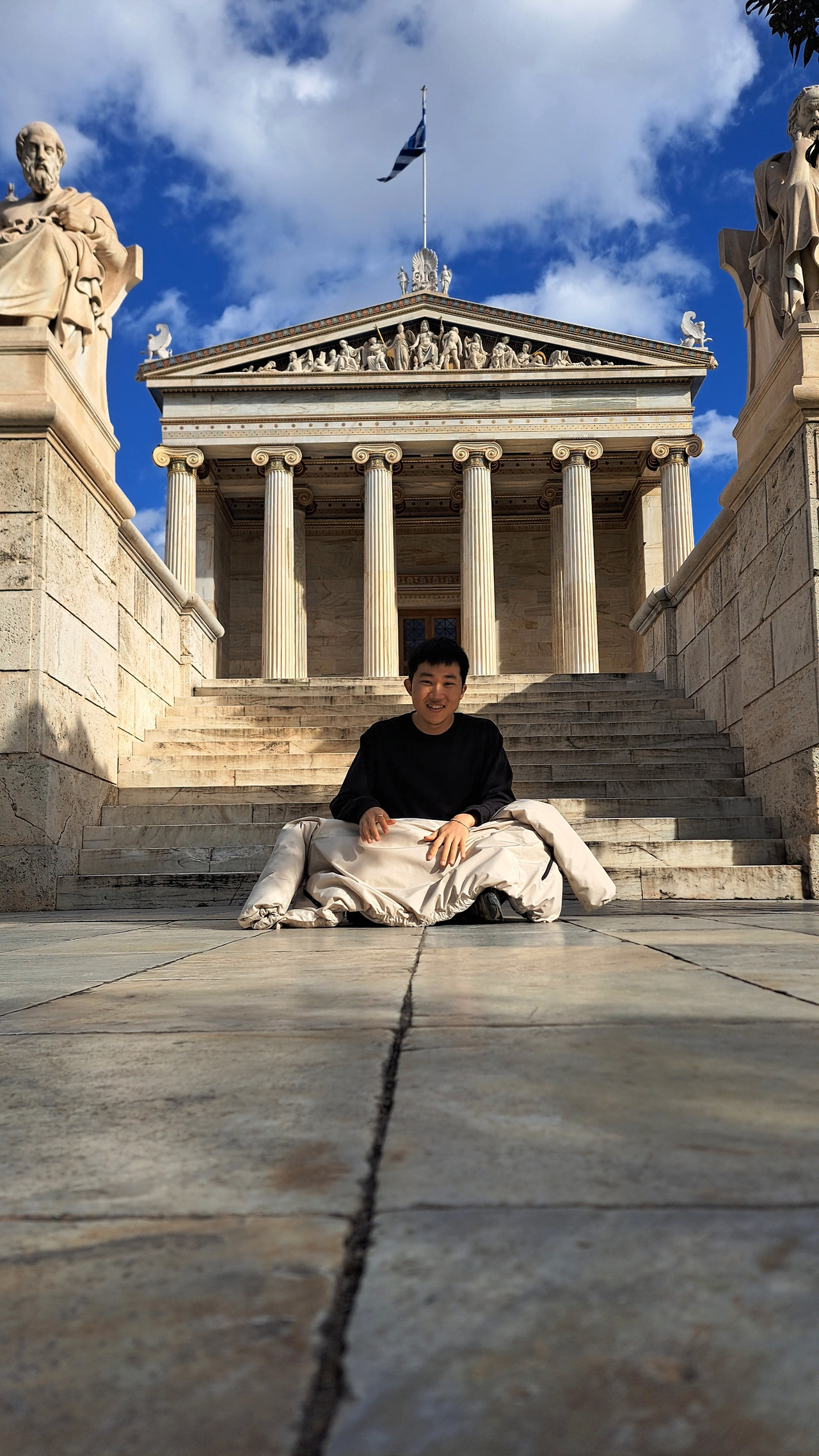 아테네 학당 크레피도마에는 좌 플라톤, 우 소크라테스 조각이 있었다. 크레피도마 윗 단 바닥에는 우 지혜의 신 아테나, 좌 예체능의 신 아폴론의 원주가 있었다. 페디먼트 부분에는 아테네의 탄생 장면이 장식돼 있었다. 아테나 여신은, 대장장이신 헤파이스토스가 신왕 제우스 대가리를 도끼로 깨니까, 거기서 나왔다고 한다. "지혜는 힘이 아닌 노동과 이성의 결합에서 나온다." 이런 메세지가 있다고 들었다. 막 독립한 나라 최고 연구기관에 잘 어울리지 않냐. 멋있어서 그날 밤에 이선생과 또 와서 사진 찍었다.