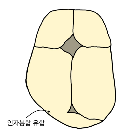 인자봉합이 유합된 경우 위에서 보았을 때 그림과 같이 유합된 쪽이 들어가있습니다.