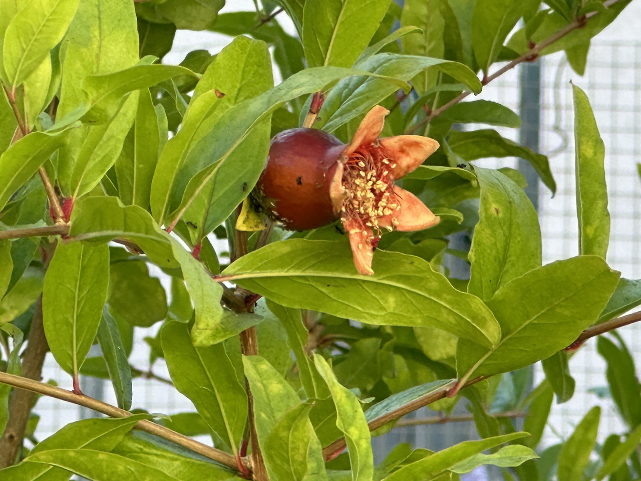 (석류나무에 열린 첫 열매가 이쁘게 자라고 있다.)