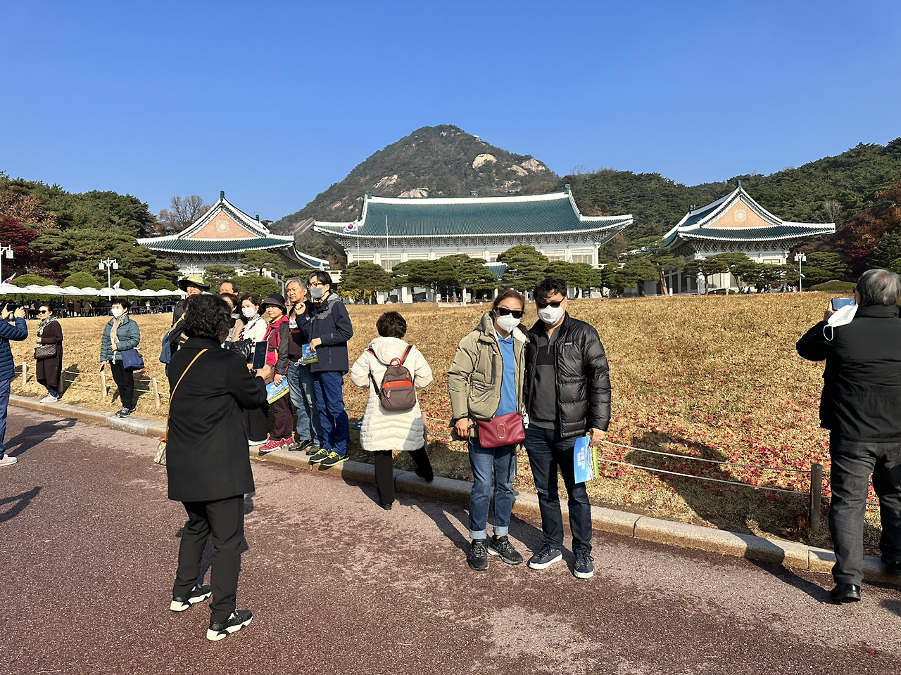 청와대 근방. 수많은 관광버스들! 우리 일행 모두들 흥분한 모습이다. 청와대? 청와대?! 나도 한국에 있었을 때 청와대를 와보지 못했는데. 이제는 밖에서만이 아니라 안에도 들어갈 수 있단다.