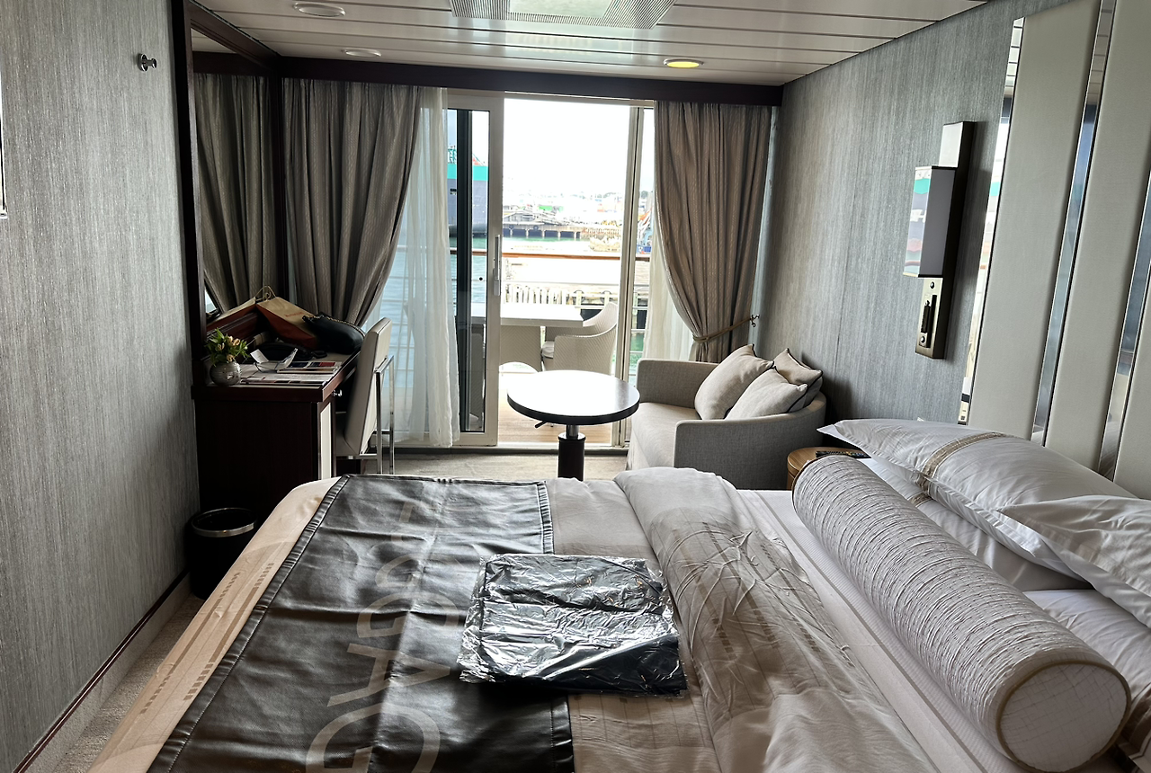 다시 아즈마라크루즈로 돌아왔다. 복잡한 서류와 여권, 비자도 내보이고 코빗예방접종카드도 내 보인 후 정해진 방으로 들어왔다. 벌써 짐들이 문 앞에서 방주인을 기다리고 있었다. 베란다가 있어 좋았지만 방과 화장실은 적은 사이즈이다. 우리는 주로 설로비티 크루즈라인을 사용하는데 배가 엄청이 크고 그래서인지 예약하는 스윗트 경우 방과 화장실은 아즈마라보다 좀 더 크다. 비교하는 이유는 비교하려고 돈 좀 더 내고 중간치 크루즈라인을 고른 것이다. 중간치크루즈, 특히 알려져 있는 아즈마라는 어떨까 해서.
