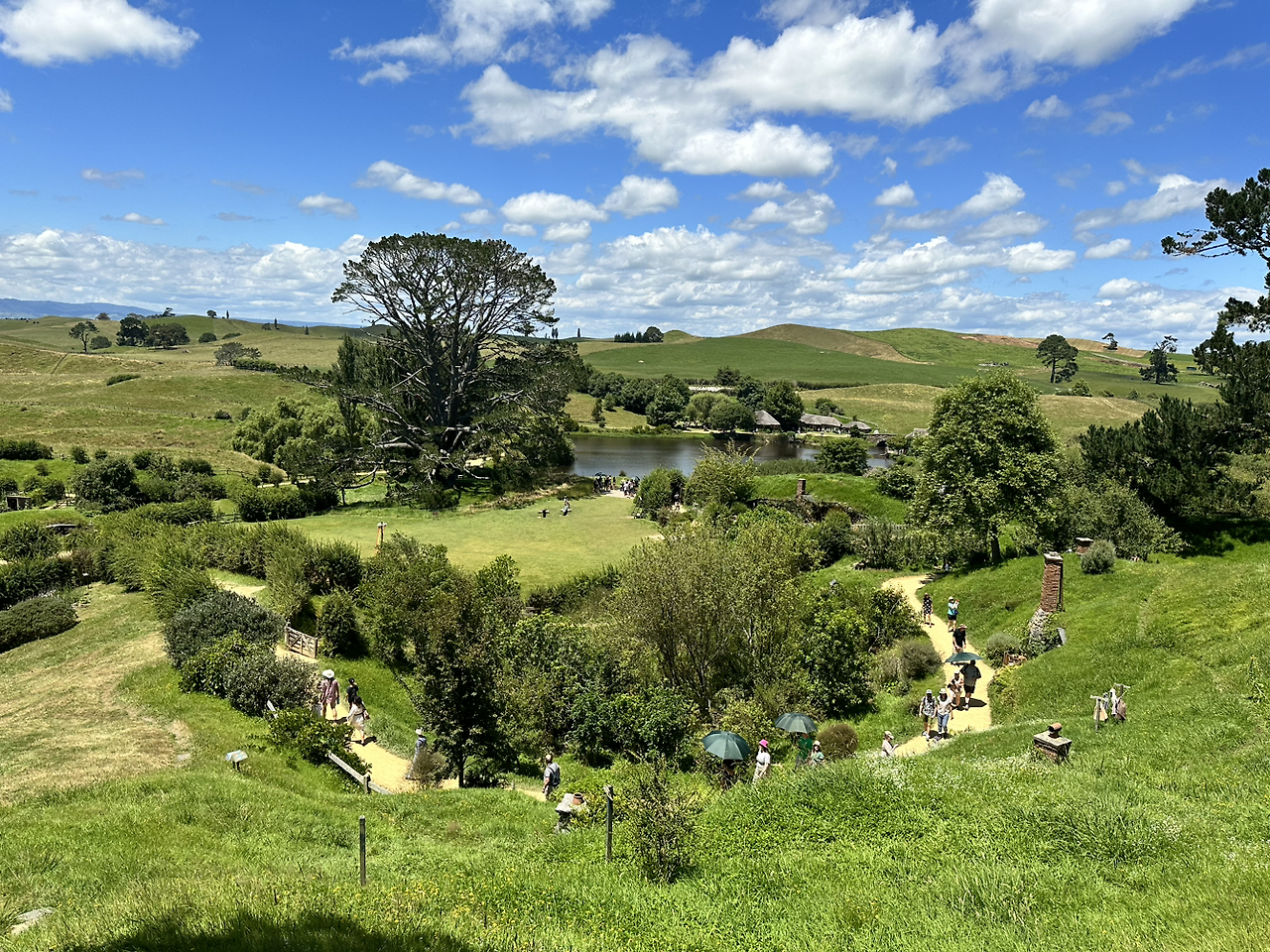 투어는 그림 같은 1,250 에이커의 양 떼 목장에서 시작된다. Lord of the Rings - Hobbiton Movie Set 장으로 가는 길은 구불거리는 길이다. 영화에서 보다 더 선명하고 아름다운 색상의 풍경. 요즘은 하루에 2천여 명(코빗전에는 3천여 명)이 온 세계에서 다녀간다.