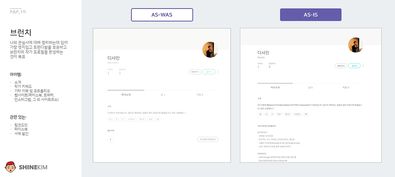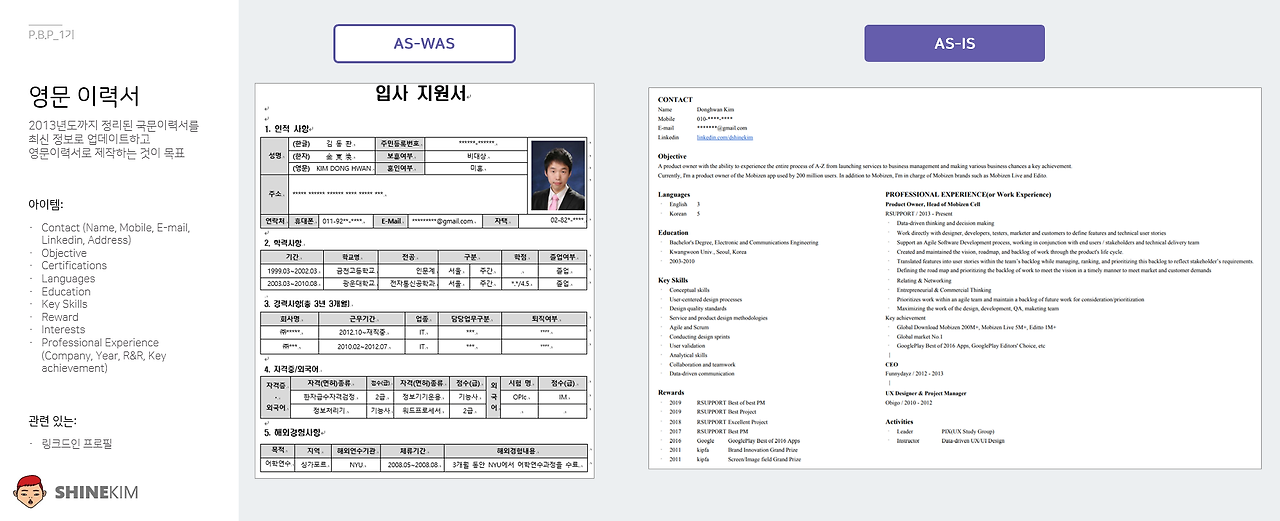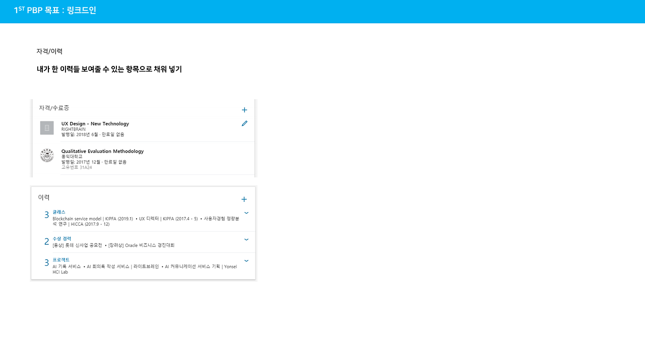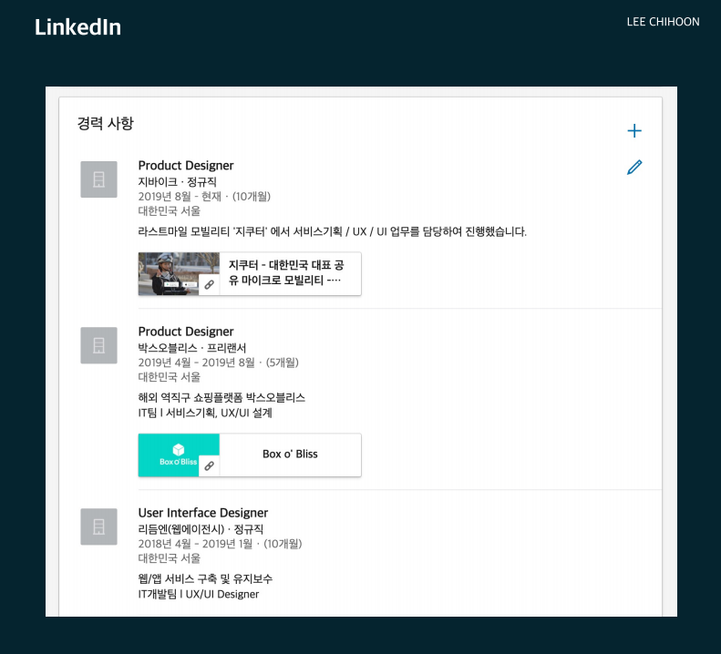 : PBP 1기에서 저는 영문 이력서, 링크드인, 브런치 프로필까지 이 3가지를 완성하는 것이 목표였습니다. 아래 결과물을 보시면 알겠지만 비주얼적인 퀄리티가 높진 않습니다. 그 이유는(2번째 밑밥은) 개인적으로 1기에서 달성하고자 하는 목표를 개인 브랜딩을 잘하기 위한 기초 작업에 중심을 두었기 때문입니다.